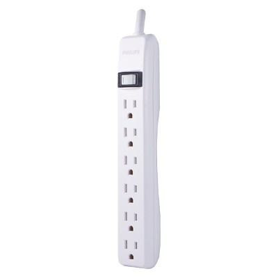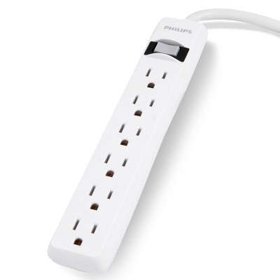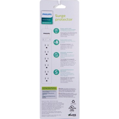 Your power does more with the Philips 6-Outlet Surge Protector. Converting one outlet into six, this powerful extension cord adds more outlets where you need them most and keeps your electronics protected from dangerous power surges. The surge protector features an integrated circuit breaker that protects your electronics if the capacity is exceeded by a power surge and automatic shutdown technology to cut power if the components expire. It also features a surge protection rating of 450 Joules to ensure your electronics are safeguarded from voltage spikes. Featuring a durable construction and sophisticated white finish, the power cord increases the cable s durability and blends in with existing d cor. For use in grounded (three-prong) outlets only, this product comes equipped with a $50,000 connected equipment policy and is backed by a limited-lifetime no-hassle replacement plan. Your outlet deserves an upgrade with the Philips 6-Outlet Surge Protector. Model #SPP3063WP/37