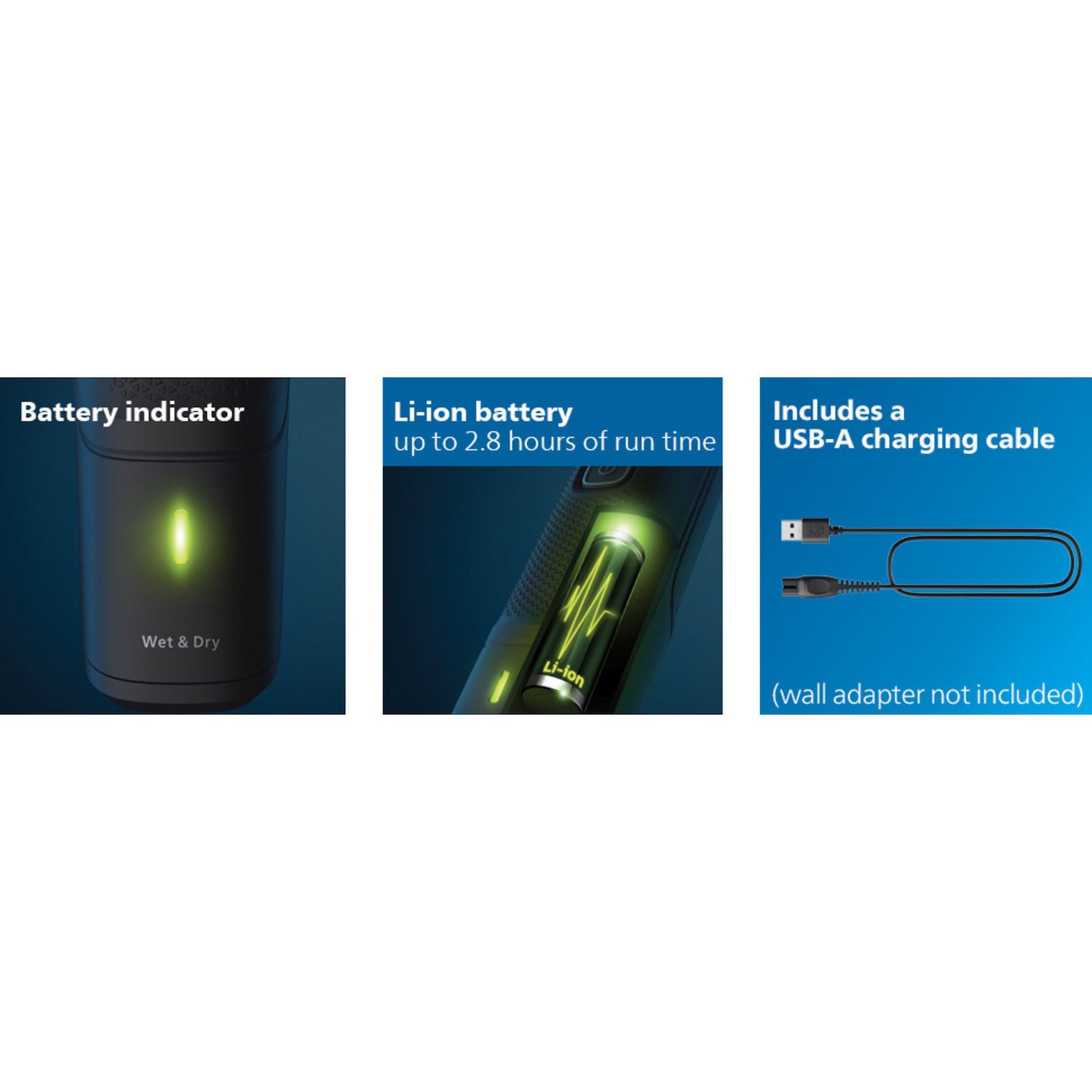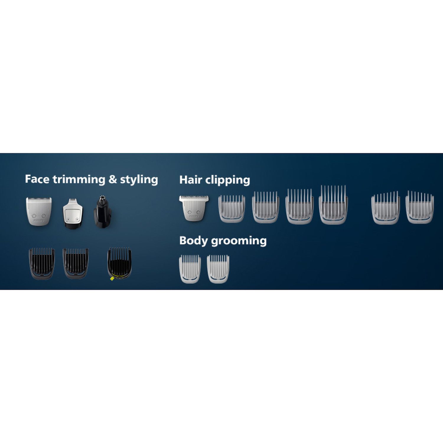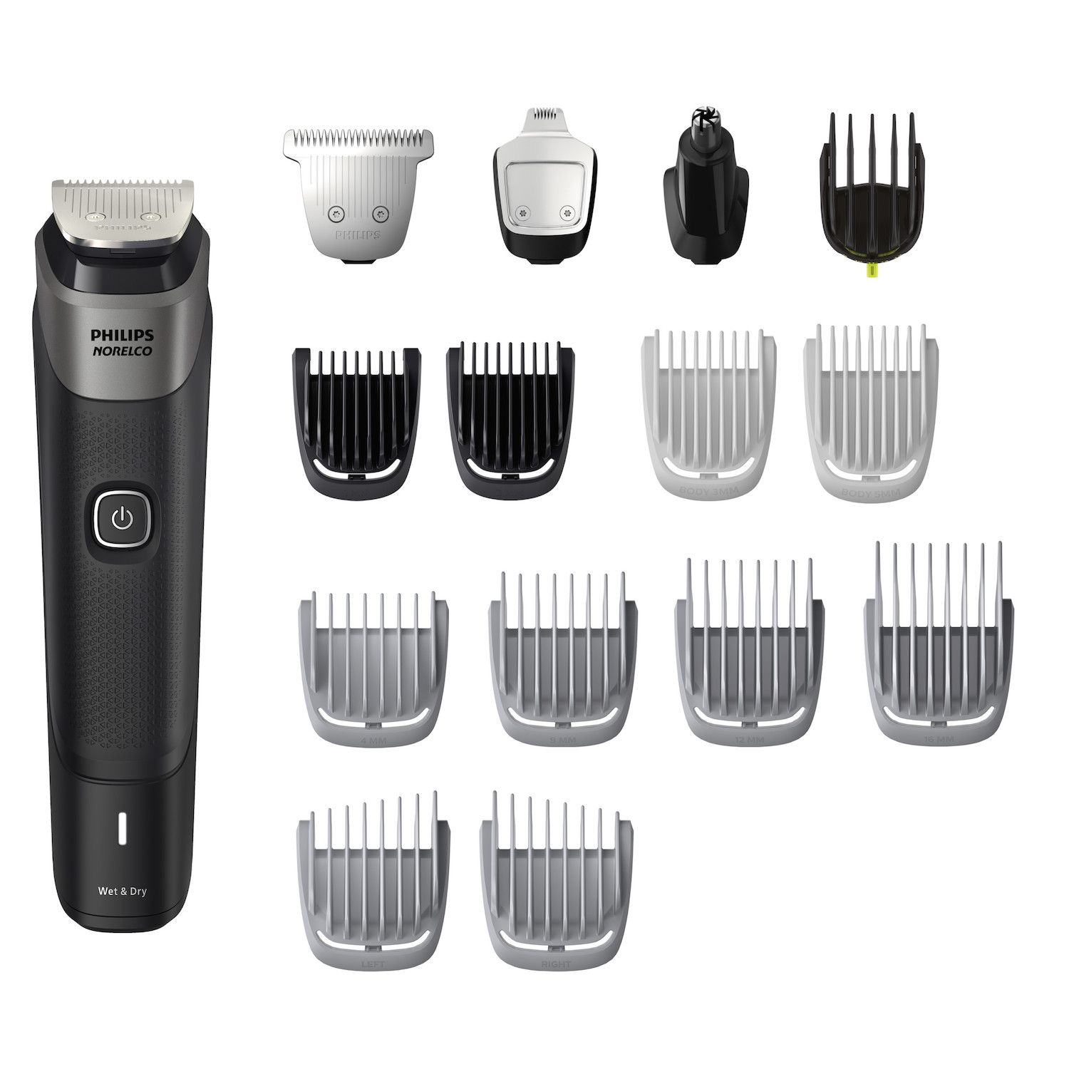 This multipurpose Philips Norelco trimmer for face, head and body styling comes with 18 pieces for all your trimming needs. PRODUCT FEATURES Stainless steel self-sharpening blades remain sharp as day one for long lasting performance, no blade oil required Multiple guards to trim face, head and body Battery light indicator to know when it's time to charge WHAT'S INCLUDED Multigroom 5000 Steel trimmer & precision trimmer Nose & ear trimmer Extra-wide hair trimmer 3-7 mm adjustable guard Four wide hair guards Two wide fading hair guards Two body guards Two stubble guards Cleaning brush Storage pouch USB-A charging cable (wall power adapter not included) DETAILS 10.9"H x 6.2"W x 4.6"D Battery life: 2.8 hrs. Battery charge: 1 hr. Lithium-ion battery