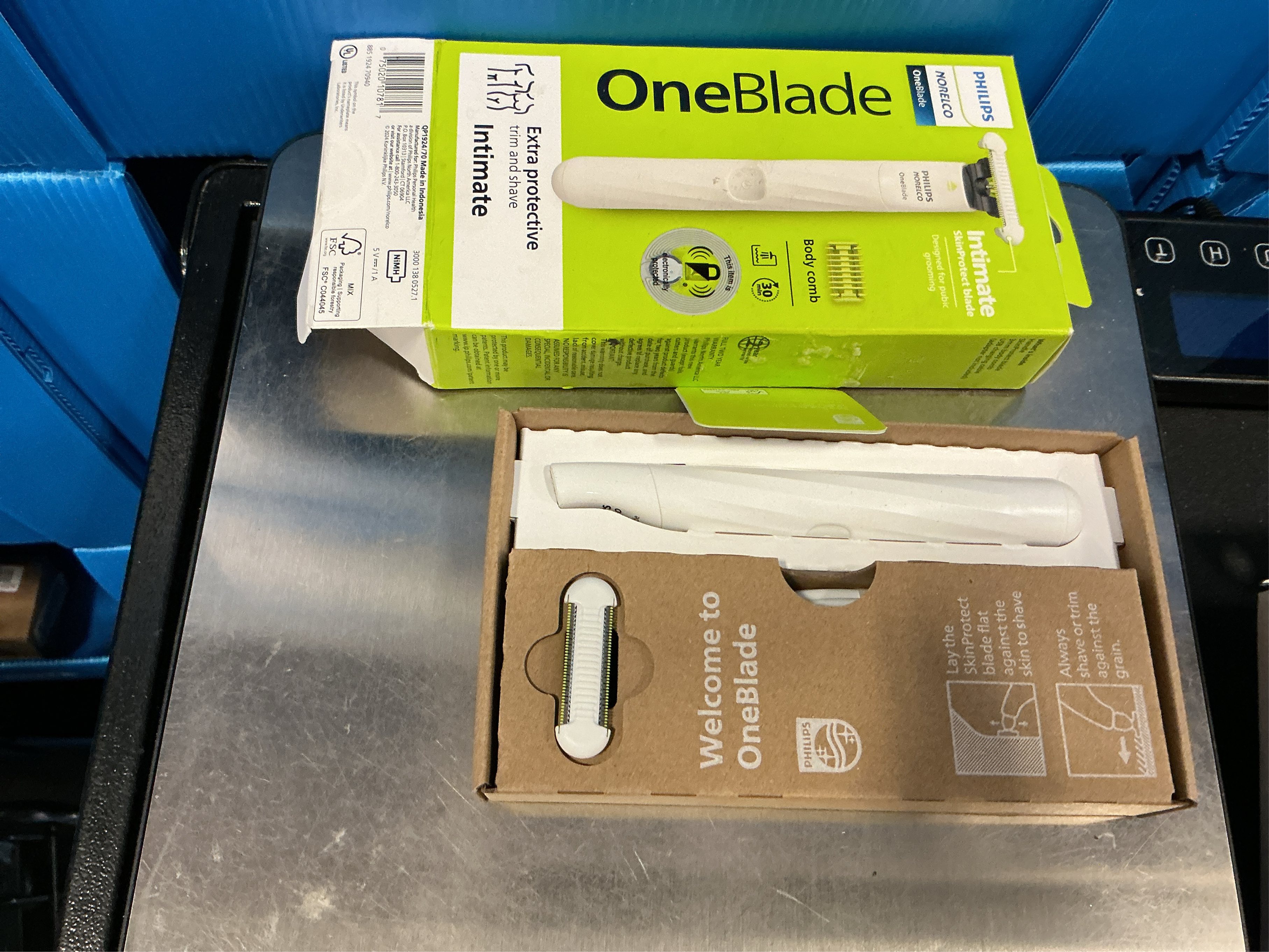 From pits to pubes, the Philips Norelco OneBlade Intimate is designed for your sensitive, intimate areas. The unique skin protector gives an extra layer of protection from nicks and cuts. Want to leave a little hair? Just click on the trimming body comb. Unique OneBlade technology cuts mows through hair at a speed of 100x per second, the glide coating and rounded tips protect your oh-so-tender skin under there and down below. The unique dual-sided SkinProtect blade also allows you to easily shave up or down to trim or style with confidence. Also included is a detachable 3mm body comb that makes it fast and easy to trim intimate and body hair. OneBlade Intimate is fully waterproof, with an IPX7 certification (up to 1m deep for 30 minutes). So feel free to shave while bathing or showering if that's what you prefer. Dry shaving's OK too, even without shaving foam. Just rinse under running water to clean. Our blades are made from stainless steel that's durable enough to last up to 4 months* (that's just 3 blade replacements per year!) Plus Philips Norelco OneBlade Intimate gives you 30 minutes of shaving and grooming on a single charge, so you can take your time. Complete recharge takes 8 hours. Our SkinProtect blade gives an extra layer of protection from nicks and cuts for sensitive armpit and pubic skin. Designed to fit every curve and corner - and not-too-close, for comfort. With the OneBlade Intimate SkinProtect dual-sided blade you can easily shave up or down and style with confidence. Our detachable 3mm body comb makes it fast and easy to trim intimate hair, in any direction you choose. OneBlade Intimate is fully waterproof so you can shave in the bath or shower, wherever you prefer- with or without shaving foam. Rinse to clean under running water. Includes: Handle, SkinProtect blade, 3mm Body comb, USB charging cable (adapter not included). Packaging switched from plastic to paper. Shop products with packaging that's designed to reduce waste. Together, we're creating packaging solutions that are designed from recycled or renewable materials.