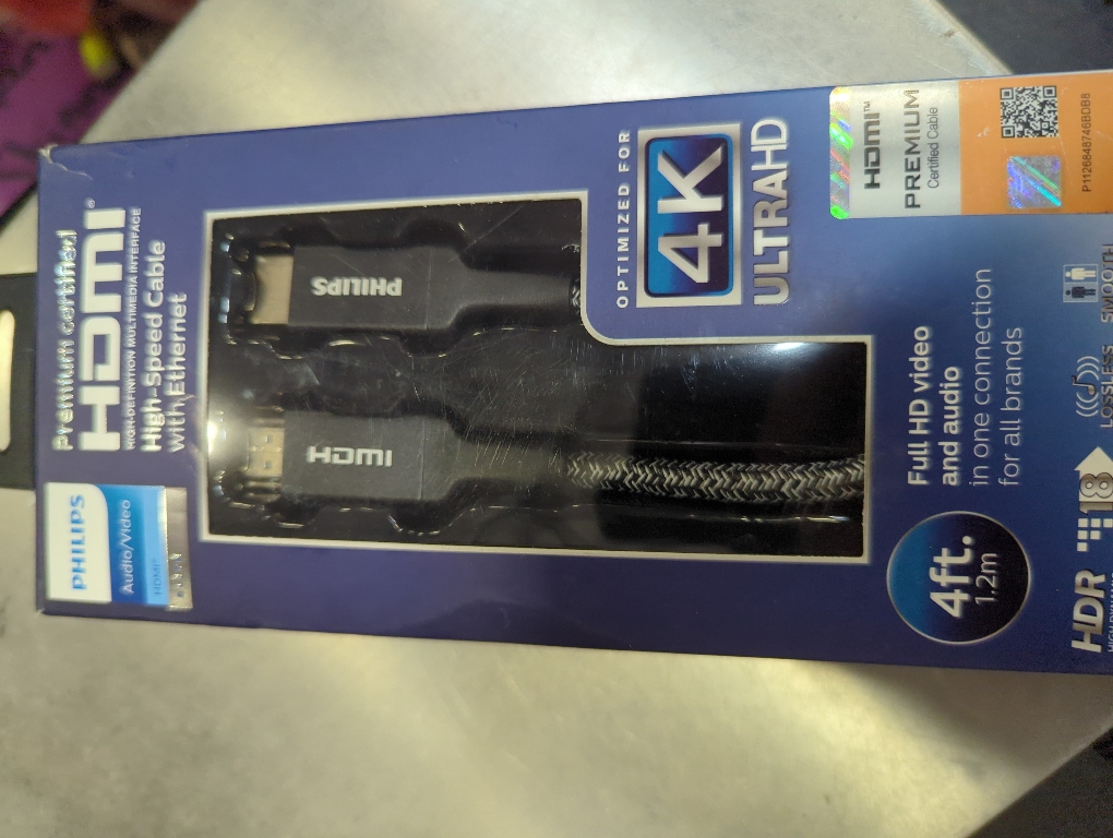 Philips Premium Certified HDMI Cable, 4 ft. 1080p 120Hz 4K 60Hz, 18Gbps Ethernet HDMI 2.0, Gold Connectors, Braided Cable, for TV, Monitor, Laptop, PS4, PS5, Xbox One X S, SWV6120P/27