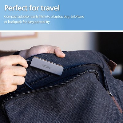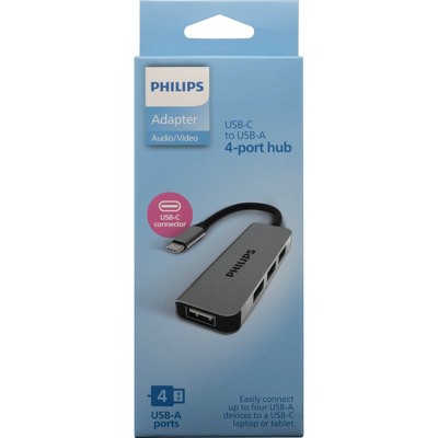 Expand your connectivity with the convenience of the Philips USB-C to USB-A 4-Port Hub. This slim, 4-port hub converts your computer’s USB-C port into four USB-A 2.0 ports that support data transfer speeds up to 480 Mbps from devices like external hard drives and flash drives. Additionally, this USB hub for laptop or tablet lets you connect vital desktop accessories, such as a keyboard, mouse or external hard drive, as well as a USB-powered lamp, desk fan and more. Simply connect the hub to your laptop’s USB-C port and then connect your USB-A accessories for plug-and-play simplicity at its best. Encased in a premium aluminum housing, this USB C hub works with all brands of USB-A cables as well as compatible electronics and desktop accessories. The hub’s compact, durable design easily fits into your laptop case, briefcase or backpack, making it ideal for travel and for use in your home, office or dorm room. Take charge of your workspace and increase your productivity with the Philips USBC to USBA 4-Port Hub.