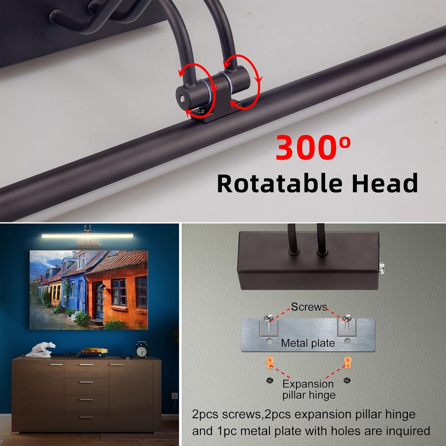 Rechargeable Picture Light--- Powered by 3.7V 5000 mAh lithium battery, 3-4 hours full charge can be support lighting up 10 hours (USB Cable Included).