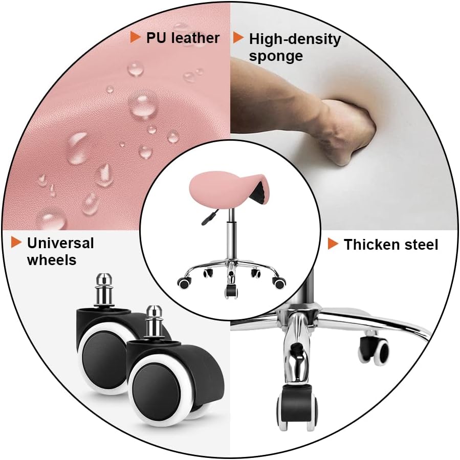 PINK KKTONER Rolling Saddle Stool PU Leather Swivel Adjustable Rolling Stool with Wheels Salon Chair