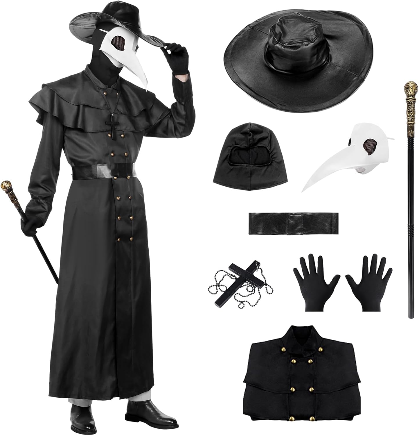 [Package Includes]1 Plague Doctor Robe,1 plague doctor hat,1 black neck hood,1 white plague doctor mask,1 belt,1 gloves,necklace,and 1 golden copper round-headed plague doctor cane.