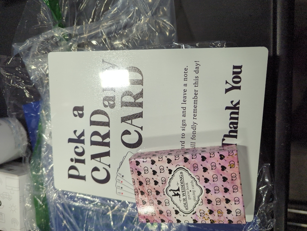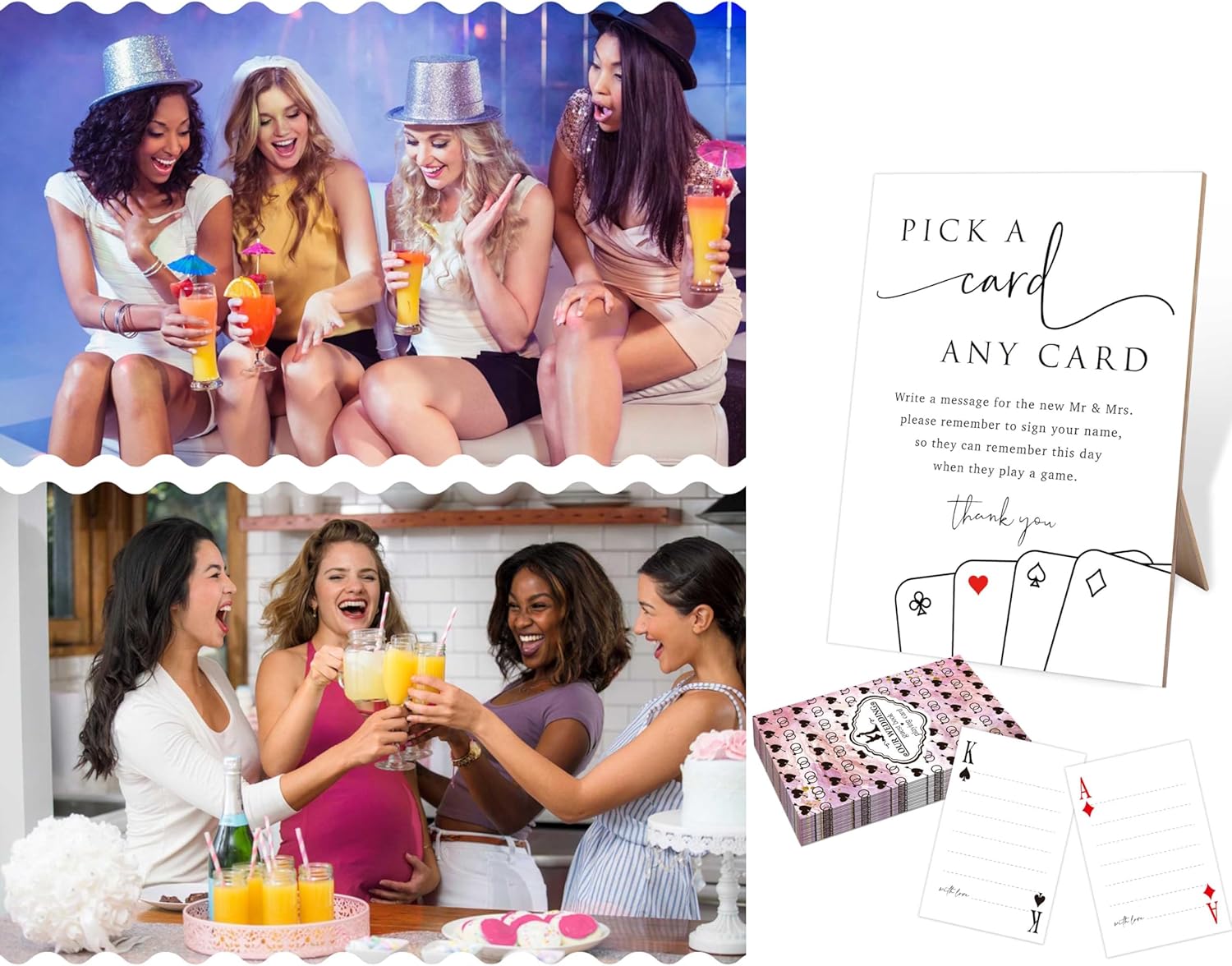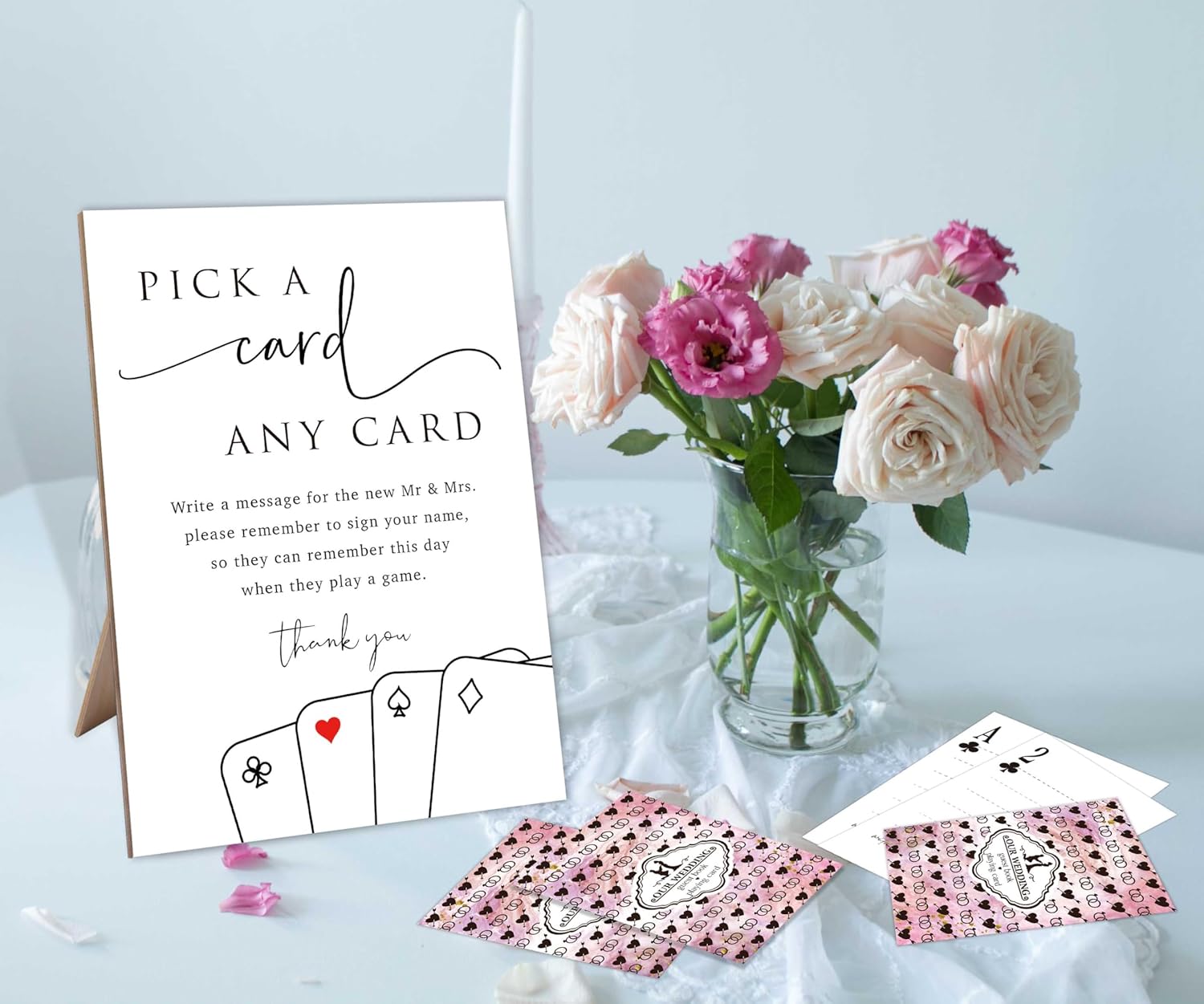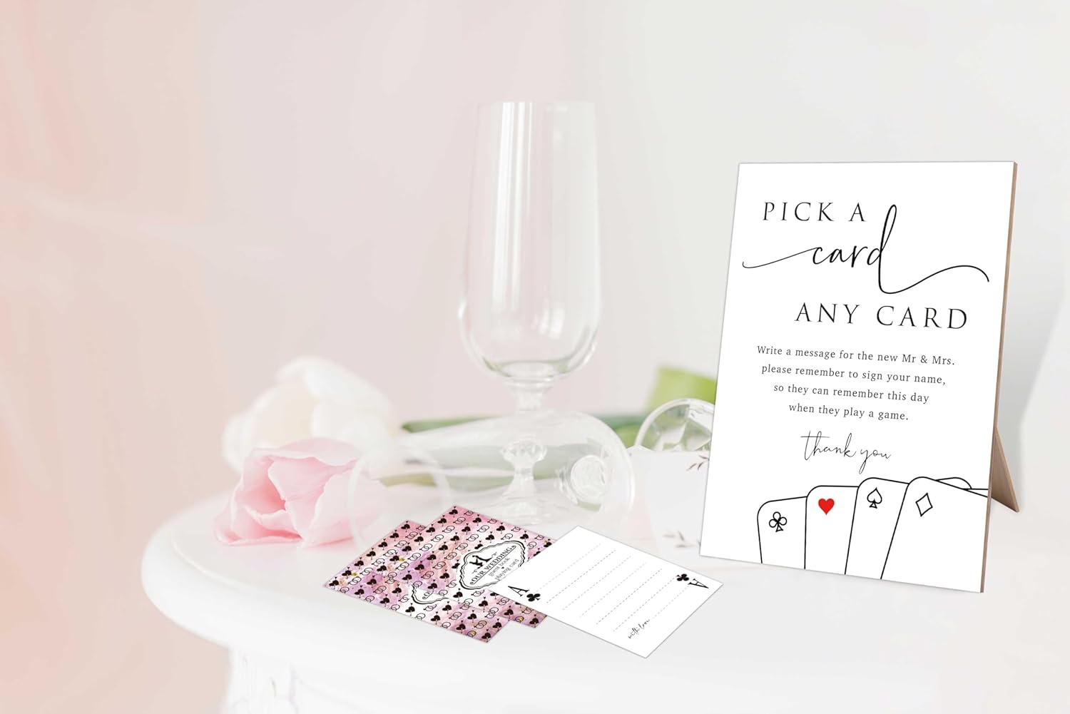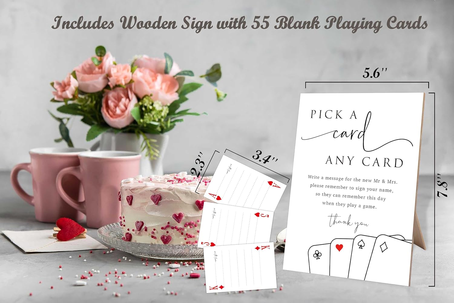 Product content: You will receive a wooden board with stand measuring 5.6X7.8 inches and 55 blank playing cards, professionally printed and beautifully patterned, the best alternative to a wedding guest book.