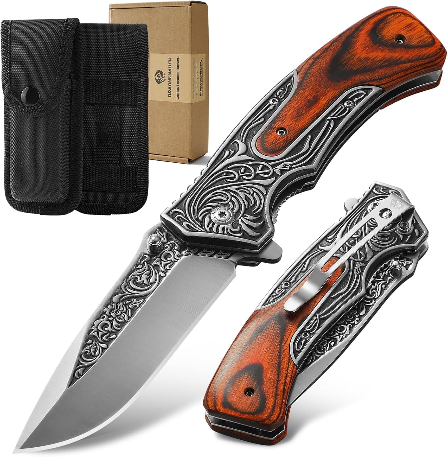 Pocket Knife for Men, 8.7" Folding Knife, 440 Stainless Steel Blade, 0.19lb, Wood Handle with 3D Retro Embossed Pattern, EDC Folding Knife for Work, Camping, Christmas Gifts