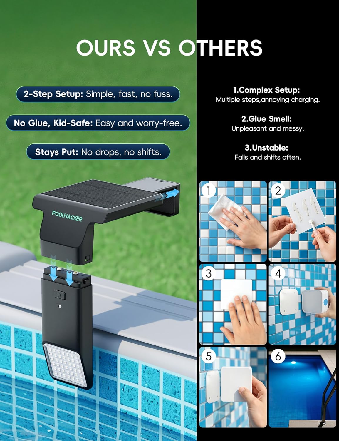 INTEGRATED DESIGN - No magnets or glue needed, eliminating complex installation and harsh smells in the pool water. The triangular structure ensures stable installation and prevents shifting. Featuring a fully waterproof design, the removable light panel can also be used as a portable light by the poolside.