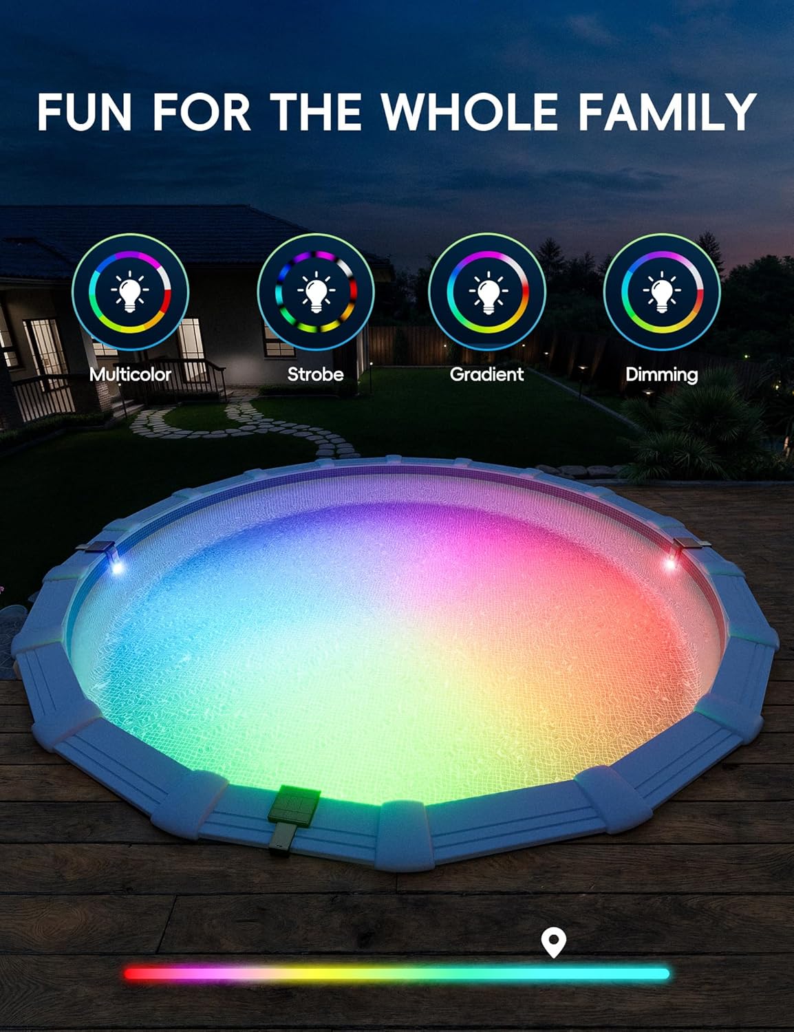 - We recommend 1–4 lights based on pool size (e.g., 18ft round: 1–2; 30ft round: 3–4; 24x12ft: 2; 16x32ft: 3–4). Brightness depends on settings, light, and darkness after sunset.—add more for a stronger vibe.NIGHT FALLS, POOL AWAKENS - The sun dips, the sky dims... then boom—your pool springs to life! With an ultra-responsive light sensor, the moment dusk arrives, a radiant glow takes over, turning your backyard into a magical nighttime escape. Hands-Free, Hassle-Free—just instant ambiance.