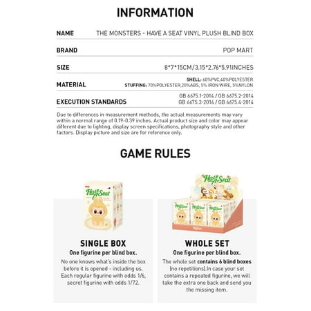 1 Case 6 Blind Boxes in a Case SIZE: Height(Excluding Hanging Loop): 17cm/6.69inches MATERIAL: Shell: PVC / Polyester. Stuffing: Polyester / Iron Wire