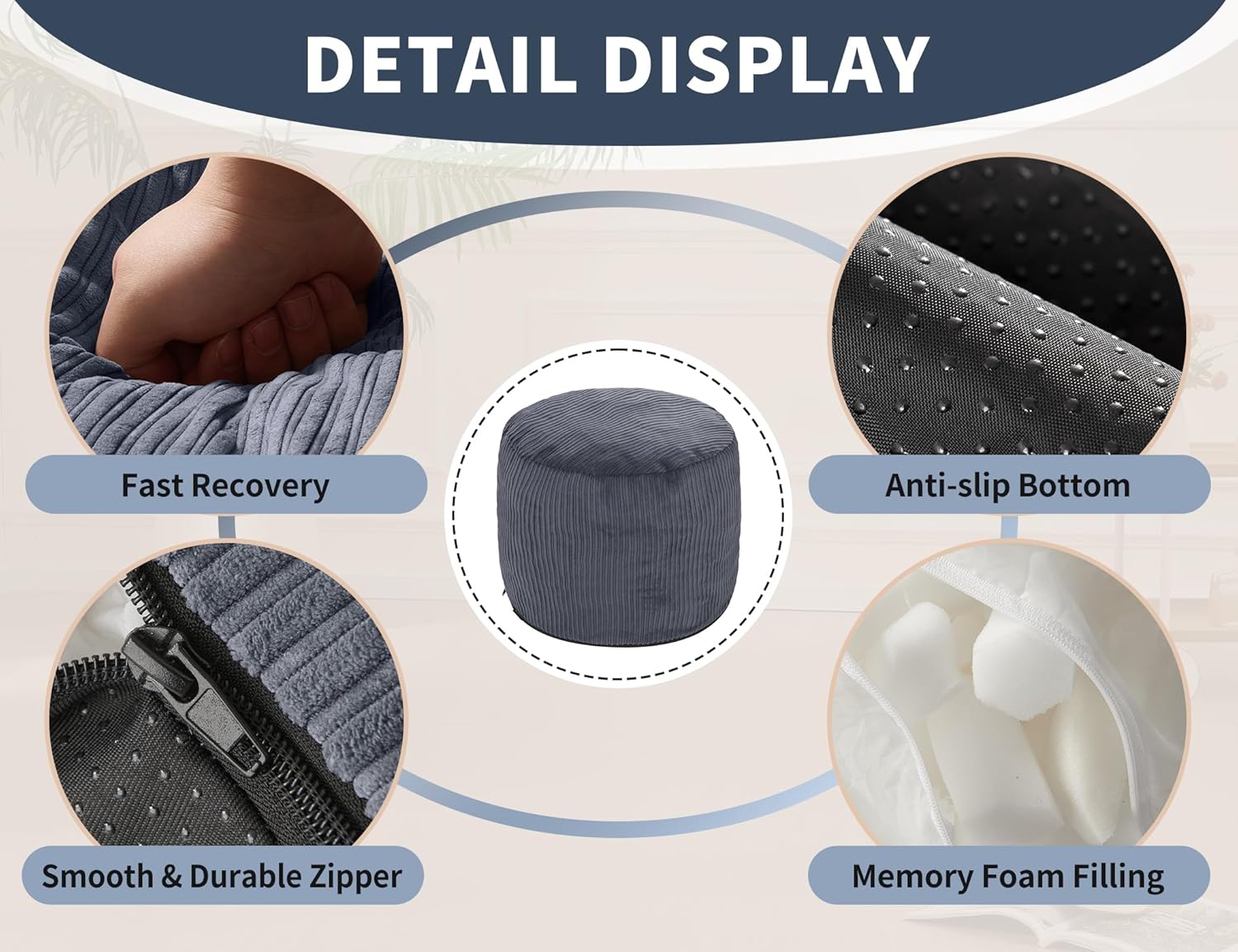 Comfortable, Compact & Stylish Large Pouf Ottoman: Made with soft, breathable corduroy and round ottoman cover filled with high-resilience foam, this footstool ottoman (26"x26"x18") offers both comfort and support. The footrest ottoman's compact size makes it perfect for different spaces, while bean bag ottoman's versatile design fits beautifully in living rooms, bedrooms, dorms, and kids' play areas.