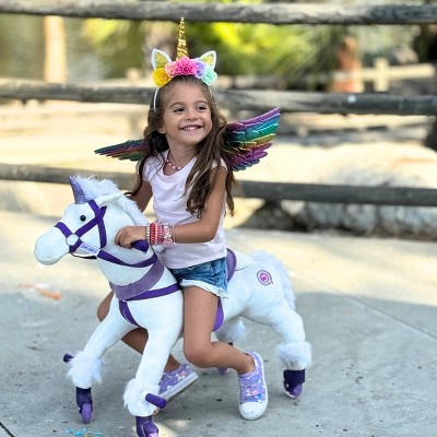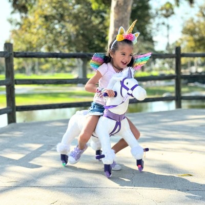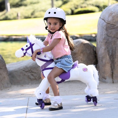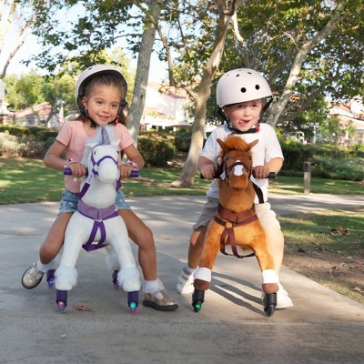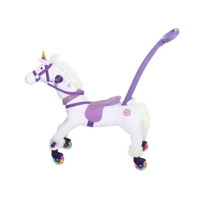 Ride, Spin, Push and Play with the ALL New Push Pony !Introducing the Push Pony , the perfect companion for younger kids aged 2 and up who wantto join the fun! Designed as a safe and engaging alternative to traditional ride-ons, the PushPony offers the full pony-riding experience in a soft, plush package. With its removable pushhandle, parents can easily guide their child on walks, while the 360-degree rotating castersprovide smooth and easy maneuverability.The Push Pony comes with interactive lights and sounds, making every ride a magicaladventure. Younger kids can enjoy the hands-on fun of riding, spinning, and playing while usingtheir feet to push themselves around. It s a healthy, active way to promote coordination andmovement for little ones.Whether it s a stroll in the park or a fun indoor adventure, the Push Pony offers a delightful,safe, and exciting ride for toddlers. It s the perfect addition to any family with young kids,allowing everyone to enjoy outdoor adventures together!
