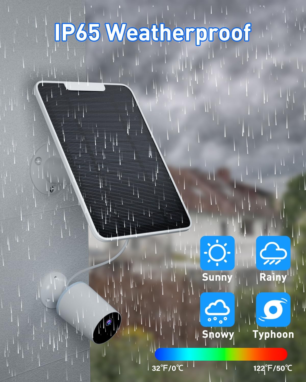 【IP65 Waterproof】The nest outdoor camera solar panel is IP65 waterproof, the surface is made of monocrystalline silicon material, the frame and bracket are made of plastic alloy, which can resist heavy snow, heavy rain and other severe weather conditions. Working conditions: 32℉-122℉(0°C to 50°C). Can be installed outdoor anywhere to provide solar energy for your wireless security camera.