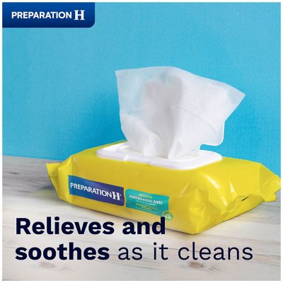 Septic safe. Relieve itching and burning. Use with ointment for greater relief. Gentle, everyday cleansing to reduce irritation. Great for daily relief. Preparation H® Flushable Medicated Hemorrhoidal Wipes, Maximum Strength Relief With Witch Hazel And Aloe provide effective hemorrhoid relief and soothe as they clean. Whether for hemorrhoid relief or for gentle, everyday cleansing, these medicated wipes provide what you need. How Many Pouches Come In The Package? This package of Preparation H Flushable Medicated Hemorrhoidal Wipes, Maximum Strength Relief With Witch Hazel And Aloe contains three pouches of Preparation H wipes. Each pouch contains 48 medicated wipes, with 144 wipes total between the three pouches. Are The Wipes Safe? Yes, these Preparation H wipes are safe for everyday use. Using these wipes every day helps with hemorrhoidal relief and reduces any skin damage by keeping the area clean. Plenty of Benefits. Preparation H Flushable Medicated Hemorrhoidal Wipes, Maximum Strength Relief With Witch Hazel And Aloe relieve itching and burning. The medicated wipes also cool, soothe and comfort the irritated area, are flushable and septic safe and can be used with other Preparation H products to maximize your relief. Symptoms of Hemorrhoids. If you worry about having hemorrhoids, understand that they are not life-threatening. Symptoms of hemorrhoids usually subside within a few days. In fact, some people can have hemorrhoids but never notice any symptoms. Symptoms are different for most people, but these are some common symptoms:. Anal pain, itch and/or discomfort. Rectal burning and/or pain. Pain when sitting down. Swelling in and around the anus. Using Preparation H Flushable Medicated Hemorrhoidal Wipes, Maximum Strength Relief With Witch Hazel And Aloe in conjunction with other Preparation H products helps reduce the symptoms that irritate you. The medicated wipes are key in that they provide everyday, gentle cleansing to help prevent any future inflammations and to keep the area of skin healthy and clean.
