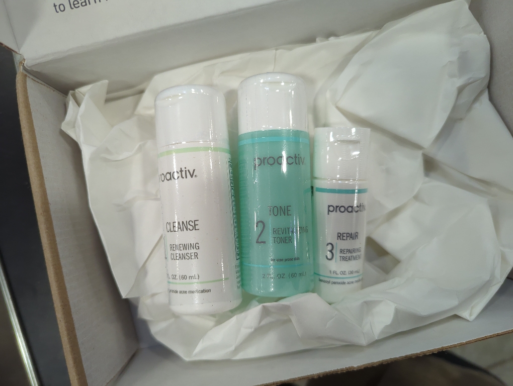 This kit includes: Proactiv Solution Renewing Cleanser, 2 FL. OZ. ; Proactiv Solution Revitalizing Toner, 2 FL. OZ. ; Proactiv Solution Repairing Treatment, 1 FL. OZ.