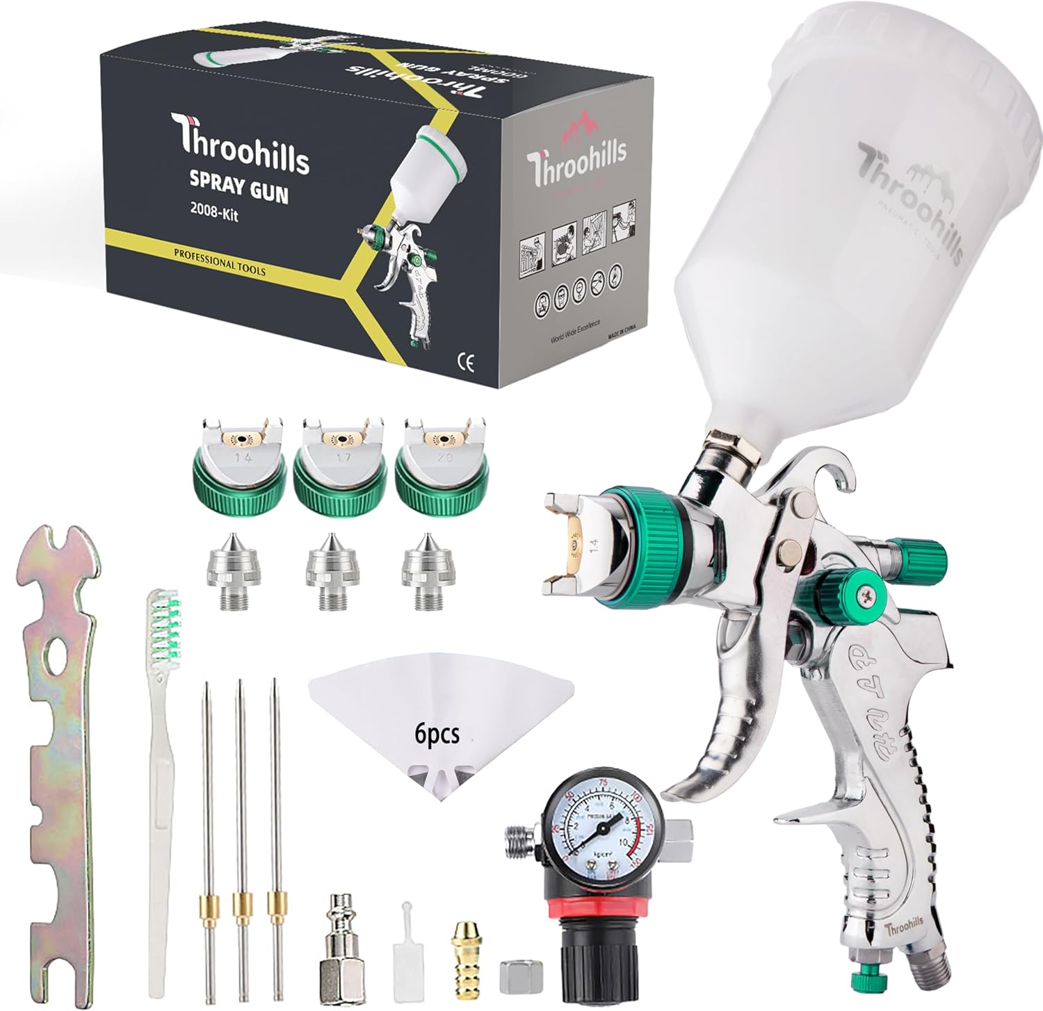 【Package Include】: 1x HVLP Air Spray Gun, 3x Size Nozzle Set(1.4/1.7/2.0mm), 1x Air Regulator with Pressure Gauge,1x 600cc Cup, 6x Paint Strainers, 1x Wrench, 1x Filters Fine Mesh and Cleaning Kit.