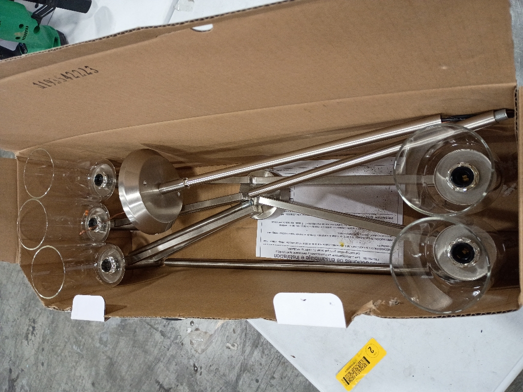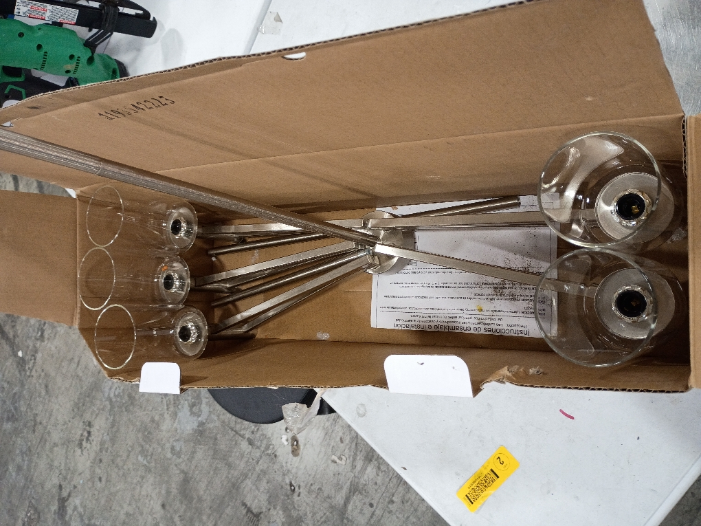 Collection Name: Roxobel. Fixture Color Family: Nickel. Fixture Finish: Brushed. Manufacturer Color/Finish: Brushed Nickel. Shade Color: Clear. Type: Chandelier. Adjustable Height: Yes. Chain/Downrod Length (Inches): 54. Depth (Inches): 24. Height (Inches): 8.5. Maximum Hanging Height (Inches): 59.5. Minimum Hanging Height (Inches): 11.5. Size: Medium. Weight (lbs.): 5.75. Width (Inches): 24. Wire Length (Inches): 72. Bulb Type: Incandescent. Bulb(s) Included: No. Dimmable: Yes. Fixture Material: Steel. For Use in Bathrooms: No. For Use in Bedrooms: Yes. For Use in Dining Rooms: Yes. For Use in Foyers: Yes. For Use in Kitchens: Yes. For Use in Living Rooms: Yes. Frosted Glass: No. Glass Type: Clear glass. Hanging Light: Yes. Light Bulb Base Type: Medium base (E-26). Lowe's Exclusive: Yes. Maximum Bulb Wattage: 60. Maximum Bulb Wattage (or Equivalent): 60. Maximum Fixture Wattage: 300. Mounting Hardware Included: Yes. Number of Bulbs Included: 0. Number of Lights: 5. Number of Tiers: 1. Power Source: Hardwired. Recommended Light Bulb Shape: A19. Shade Material: Glass. Shape: Shaded. Style: Modern/contemporary. Swag Kit Included: No. Type of Hanging Device: Downrod. Usage Rating: Dry. Use Location: Indoor. Slope Ceiling Compatibility: Yes. CA Residents: Prop 65 Warning(s): Yes. ENERGY STAR Certified: No. Safety Listing: cULus safety listing. UNSPSC: 39111500.