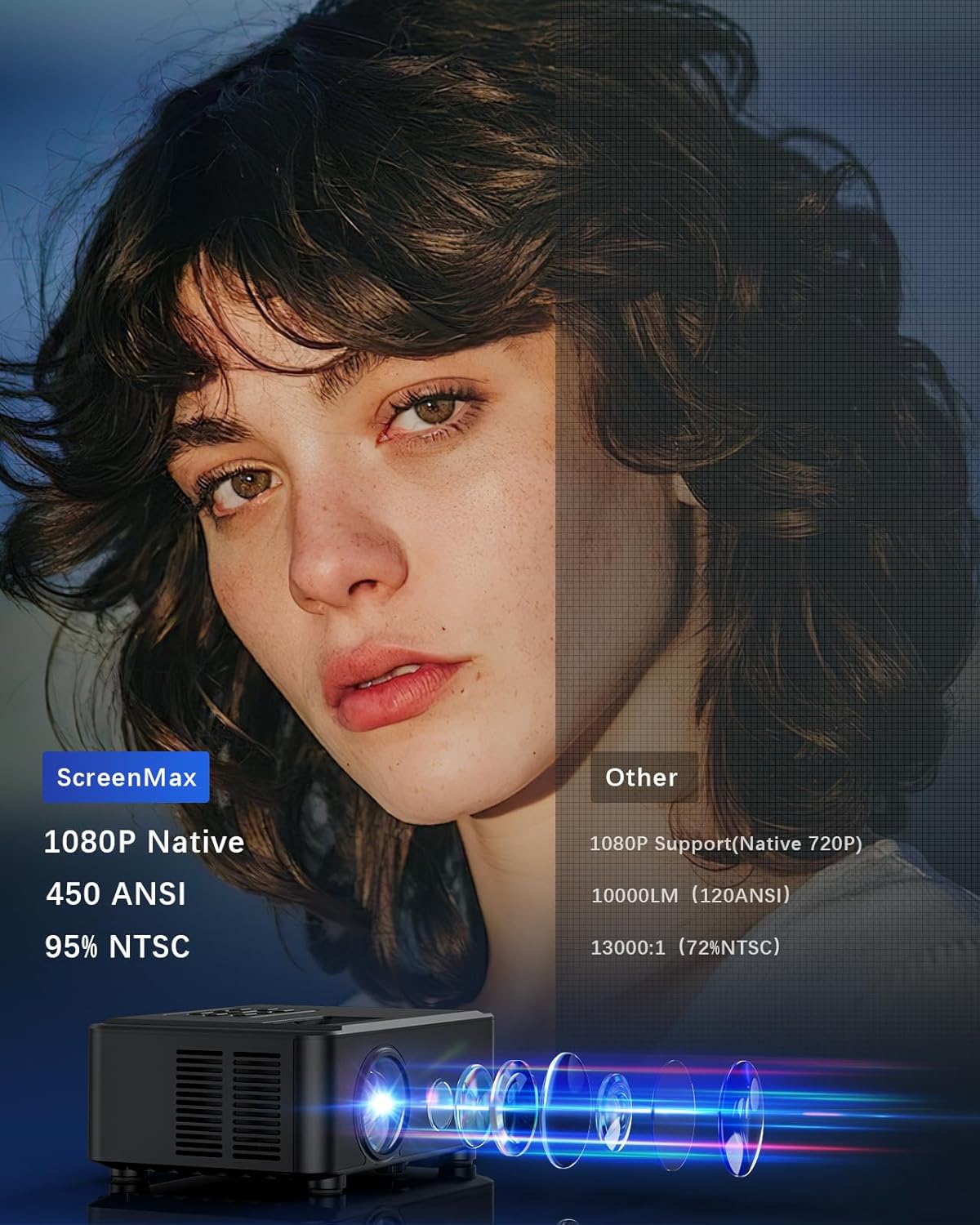 ➤【Native 1080P, 450 ANSI, 85% Uniformity】 The SP133D HD projector boasts native 1080P resolution, Unlike many other video projectors that claim 1080P support but deliver only 720P. This genuine 1080P home projector features 2.13 million pixels, providing a brightness of 450 ANSI lumens & uniformity of 85%. This clarity is twice that of a 720P projector, which typically has only 920,000 pixels. Lower-pixel projectors often offer a brightness of just 150 ANSI lumens and a uniformity as low as 65%.