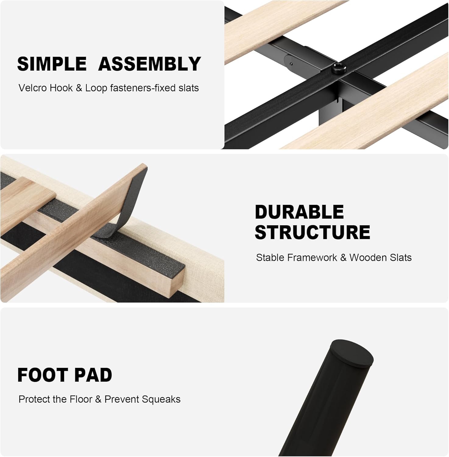 No Box Spring Needed: Platform bed design eliminates the need for box springs. Sturdy slats support your mattress directly, with Velcro connections to prevent noise and simplify installation