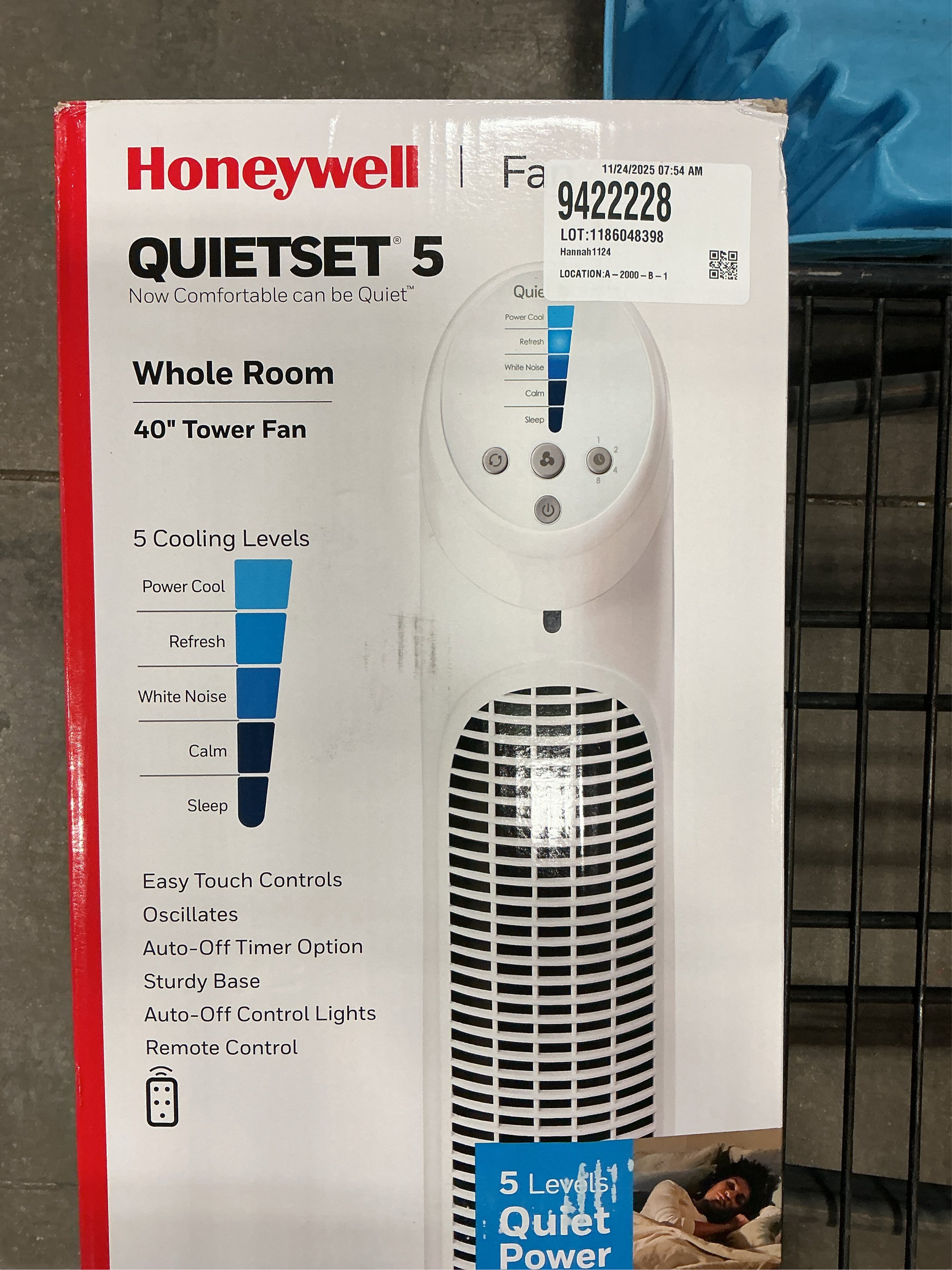 Quiet Set whole room tower fan with 5 speeds and oscillation. Easy to set up and no tools required. Remote control, Auto-dim lights reduce to 50% after 15 sec. 1, 2, 4 and 8 hour auto shut-off timer.. Assembly Required: Yes. CFM: 0. Color Family: White. Color/Finish: White. Control Type: Remote Control. Cord Length (ft.): 0 ft. Decibel (Sound) Rating: 01-Not Measured. Fan Features: Adjustable Height,Oscillating,Remote Control. Fan Type: Tower Fan. Housing Material: Plastic. Indoor/Outdoor: Indoor. Input Wattage (watts): Not Measured. Mounting Type: Standalone. Number of Fan Speeds: 4-6 Speeds. Number of Fan Speeds: 5 Speeds. Plug Type: Parallel. Power Type: Plug-In. Product Weight (lb.): 10.25 lb. Returnable: 90-Day. Voltage (volts): 120. Certifications and Listings: ETL Listed. Fan diameter (in.): 0 in. Product Depth (in.): 10.75 in. Product Height (in.): 32.875 in. Product Width (in.): 8.25 in. Height (in.): 32.875 in. Fan Features: Oscillating. Fan Features: Remote Control. Power Type: Plug-In. Number of Fan Speeds: 5 Speeds. Number of Fan Speeds: 4-6 Speeds. Cord Length (ft.): 0 ft. Fan Features: Adjustable Height