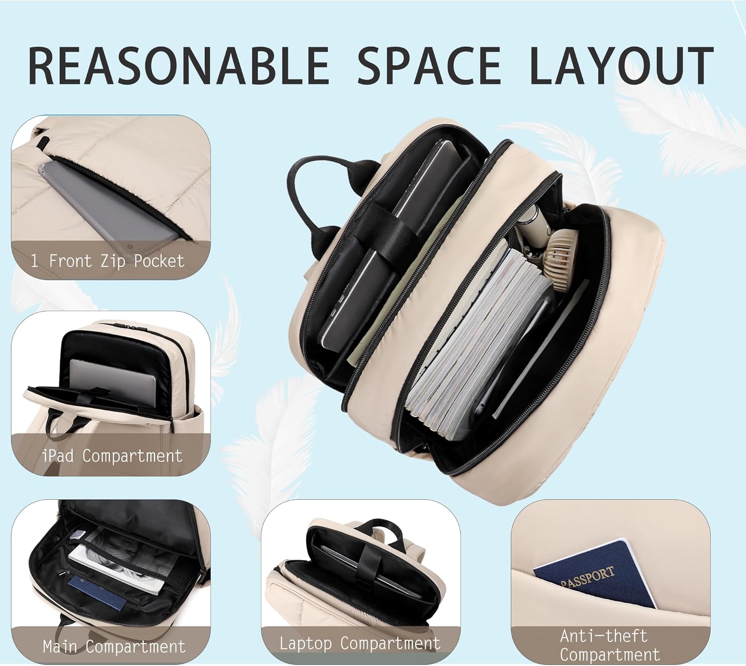 LARGE CAPACITY: The separate laptop compartment fits up to a 15.6'' laptop. The large main compartment is roomy for daily necessities, such as A4 folders, magazines, tablets, chargers, power bank, and clothes,there's a keychain in the front pocket
