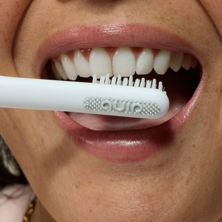 Modern, sleek Electric Toothbrush, 100% recyclable paper packaging Sensitive sonic vibrations, 2-minute timer, 30-second pulses 3-month battery life with a single AAA battery (no wires or charger) Slim, lightweight metal handle, water-resistant, shower-safe Replaceable soft-bristle brush head with tongue scraper & travel cover Helps remove plaque, prevent & reduce gingivitis American Dental Association-Accepted