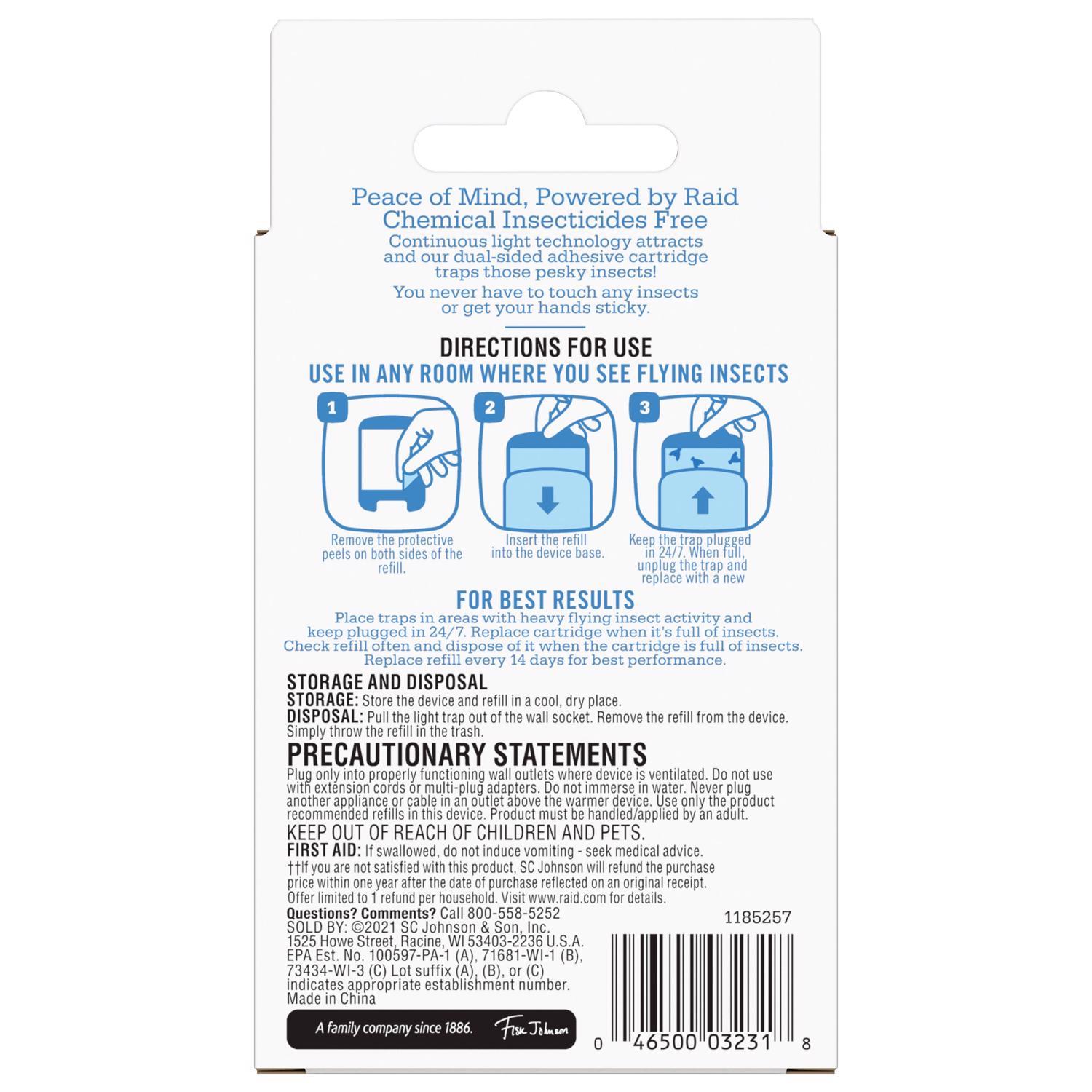 The Raid Essentials Light Trap harnesses continuous light technology to attract flying pests without the use of chemical insecticides. Once attracted, flying insects are trapped by an adhesive backing hidden by our Essentials Shield.