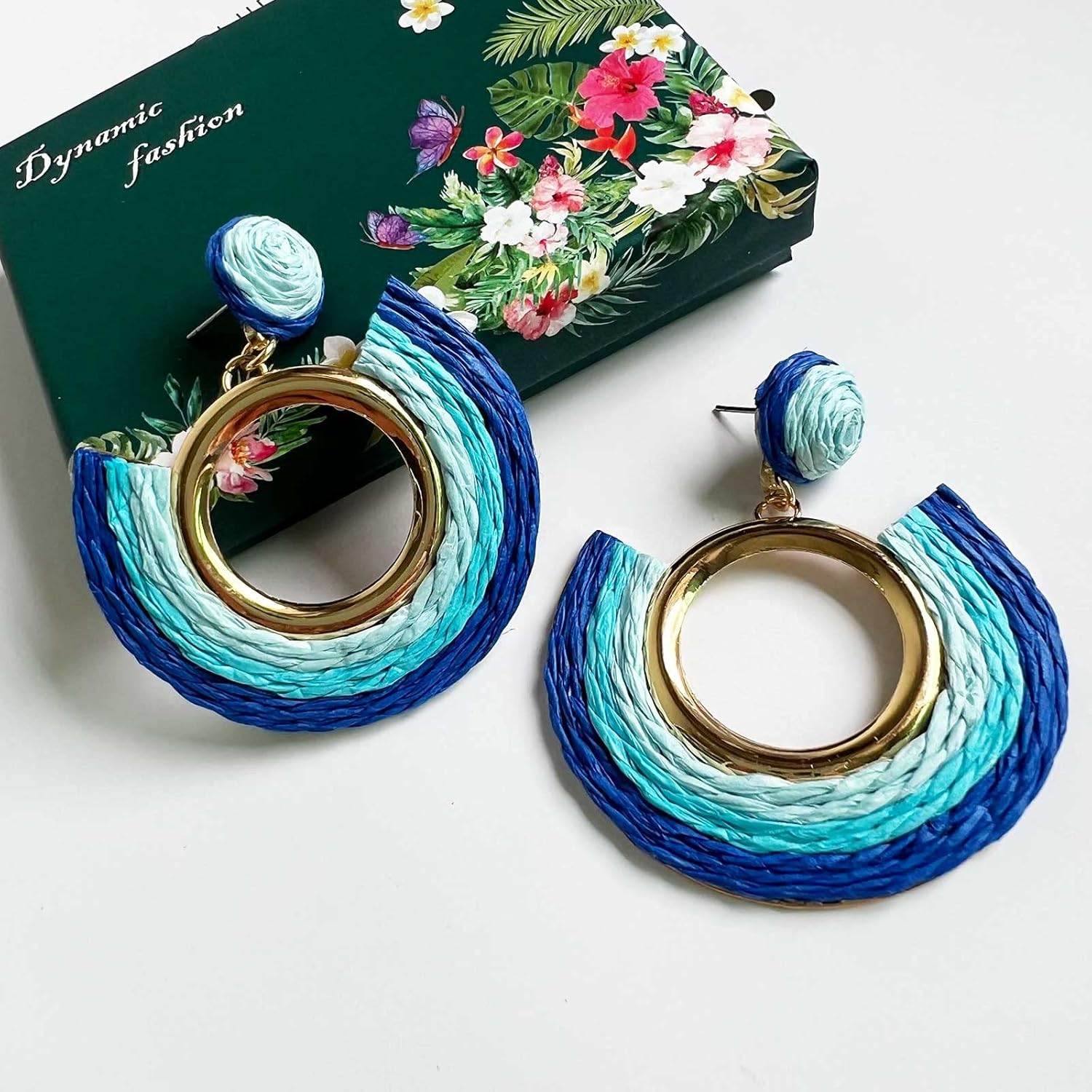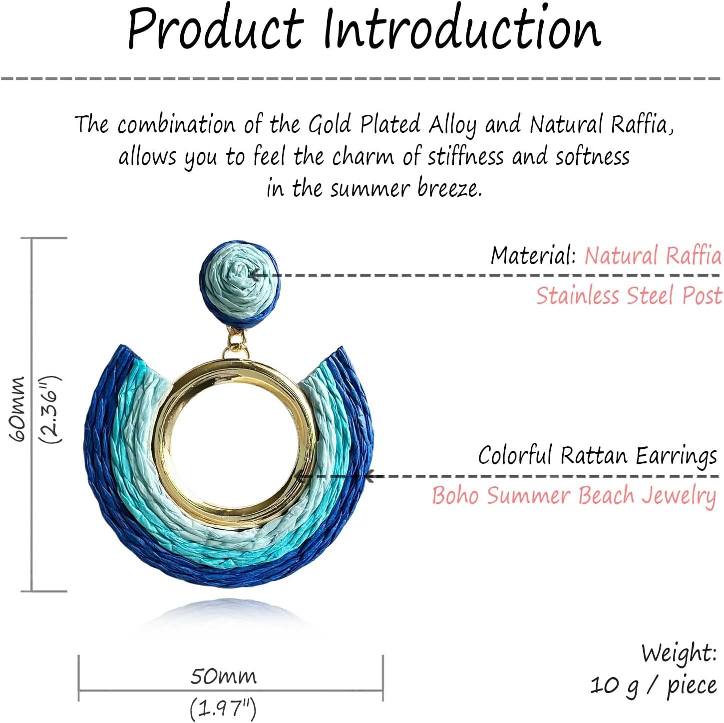 Material: Rattan earrings for women, made of natural raffia, shiny gold plated alloy round and stainless steel needle. post back closure, Stylish and Elegant.