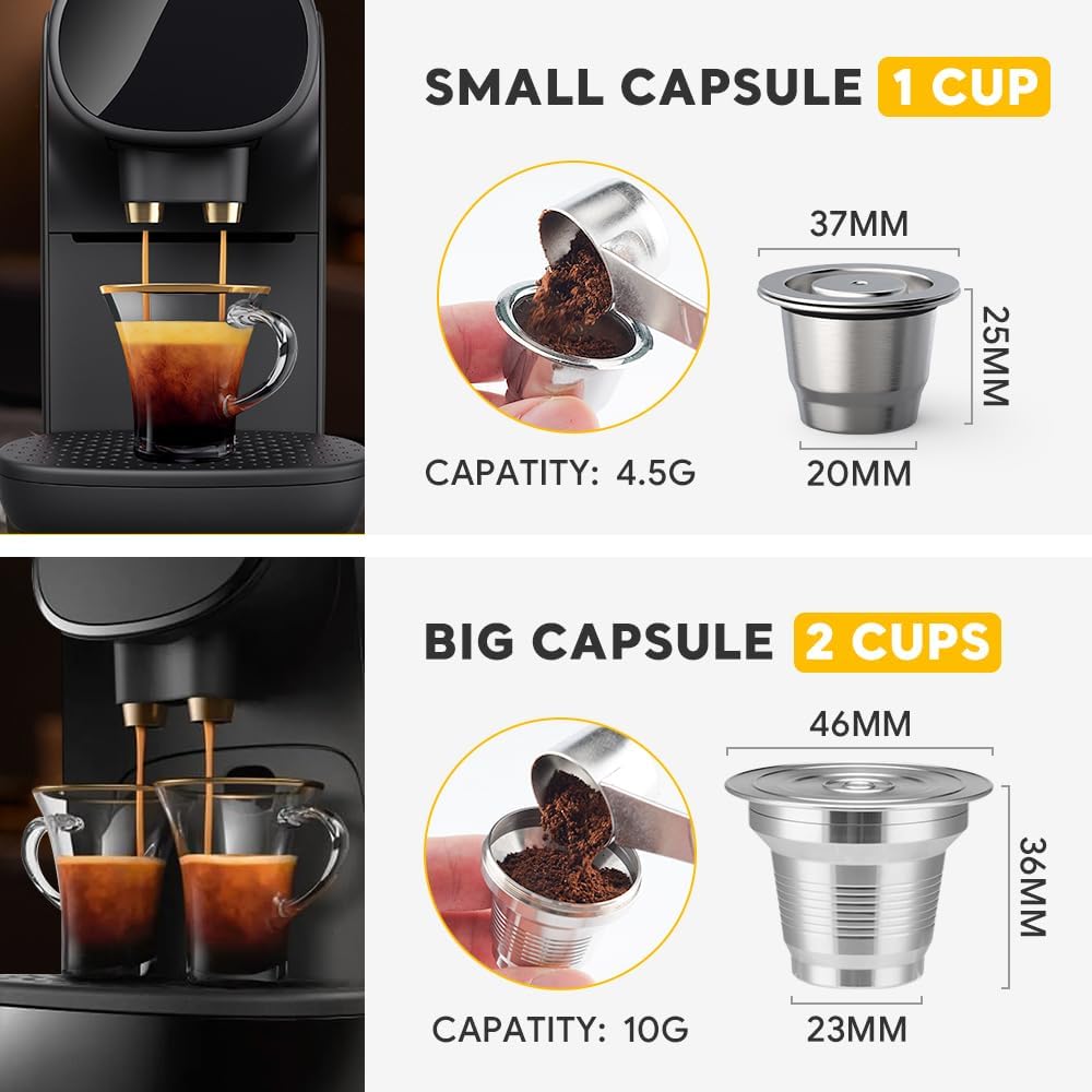 Refillable Design: Enjoy the freedom to fill your capsules with your favorite coffee grounds. Each capsule can accommodate approximately 4.5 grams for the small pod and 10 grams for the large pod, allowing you to customize your coffee to perfection.