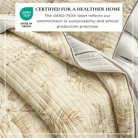 King size include 2 shams Ridge & Cove Tropical Inspired Prints: This quilt embodies the laid-back elegance of island living, featuring lush tropical foliage and vibrant florals in soft, sun-washed hues of pink, blue, and green. Perfect for bringing a slice of paradise into your home, this design captures the spirit of coastal retreats and breezy escapes, blending timeless tropical charm with a refined, carefree style. Unmatched Comfort: This quilt set is crafted with natural, breathable cotton fibers for the outer layer, while the down alternative offers lightweight warmth. This quilt set provides you with ultimate comfort while sleeping year-round. Easy Care: Designed for ease and durability, this quilt set is machine washable on cold, tumble dry on low, and removed promptly for a fresh and clean bedding set. This set includes one king size . Standard of Safe Bedding: Sourced and crafted with clean and safe threads and fabric. These quilts are safe for you, your family, and your pets to snuggle up with every night. Certified OEKO-TEX® 100: Every piece of this quilt has passed safety tests for the presence of harmful substances.