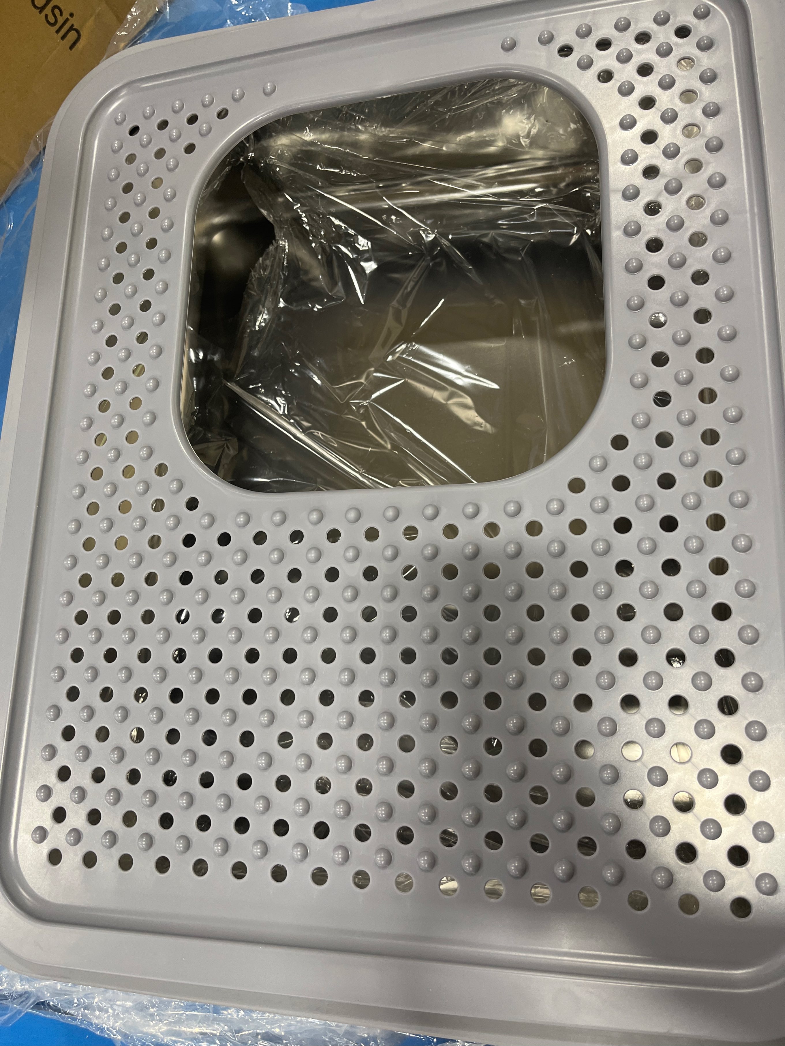 Leak Proof: The newly upgraded cat litter box has a tighter connection between the upper and lower parts, and the tilt angle inside the box can better prevent urine leakage. In addition, the top also adopts a hole design, with many dense small holes distributed, which can screen out the litter brought out by cats when they jump out of the litter box, so that it falls back into the box and will not fall onto the floor.
