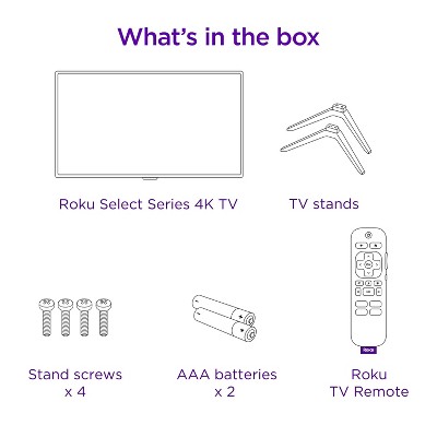 Roku Select Series 4K TVs are thoughtfully designed to upgrade your entertainment at an incredible value. Enjoy your streaming favorites in brilliant 4K HDR picture that s optimized for your room lighting with automatic brightness. Catch every word with built-in sound features like auto speech clarity and night mode. Switch to your inputs and watch free live TV right from the home screen, or use the remote s pre-set shortcut buttons to quickly launch popular streaming apps. A smart TV made by Roku? Now that makes sense. Highlights: The smart TV that makes sense: Roku Select Series 4K TVs are built by Roku to bring viewers a brilliant streaming experience with superior picture quality at an incredible value. Made by Roku: From the brand you trust to make streaming easier comes a thoughtfully designed 50-inch smart TV powered by the delightfully simple Roku experience. Brilliant 4K picture: Stunningly sharp 4K resolution brings out the rich detail in your entertainment with four times the resolution of HD. Color that pops: Watch in incredible HDR10+ color, contrast, and brightness that brings your favorite entertainment to life. Automatic brightness: Avoid fiddling with settings with a screen that automatically adjusts based on your room s lighting. Designed for seamless streaming: With features like fast Wi-Fi and streaming apps that launch in a snap, Roku Select TVs get you to your entertainment quick and easy. Customizable home screen: Roku smart TVs put your favorites streaming apps, inputs, and free live TV front and center, so you can spend your time streaming not scrolling. Endless free TV: Enjoy the best selection of free entertainment with 400+ live TV channels, award-winning Roku Originals, in-season shows, hit movies, kids TV, and more. Specifications: Dimensions (Overall): 25.7 Inches (H) x 44 Inches (W) x 3.2 Inches (D) Weight: 19.8 Pounds Electronics Condition: New Electronics Features: Sleep Timer, Streaming Capability, ROKU Voice Assistant Built-In, Wi-Fi, Tv Apps, Smart TV, Built-In ROKU Streaming Aspect Ratio: 16:9 Aspect Ratio Screen Resolution: 4K Native screen refresh rate: 60 Hz Wireless Technology: Wi-Fi Screen Size: 50 Inches Stand Depth: 10.2 Inches Industry or Government Certifications: No Certifications Stand Width: 43 Inches Compatible With: Google Assistant, Netflix, Paramount+, Max, Amazon Video, FuboTV, Alexa, YouTube TV, Hulu with Live TV, Disney+, Sling TV, Peacock, Apple TV+ VESA Mounting Standard: 400x300 Product Depth with Stand: 10.2 Inches Product Height with Stand: 28.3 Inches Product Width with Stand: 44 Inches Backlight type: LED Direct Lit Smart platform: Roku Voice assistant built-in: No Voice Assistant Built-In Number of HDMI ports: 4 High Dynamic Range (HDR): Hybrid Log-Gamma (HLG), HDR10+ Screen Mirroring Technology: Apple Airplay Battery: 2 AAA Alkaline, Required, Included