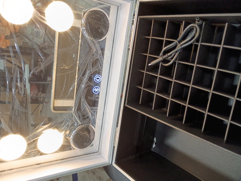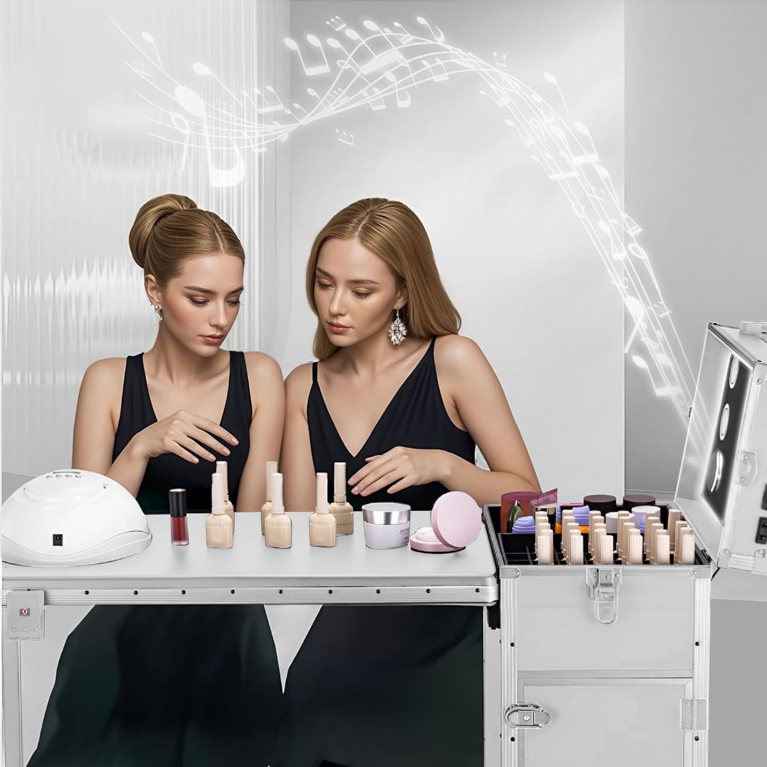 Rolling Manicure Table Foldable Nail Desk 4 Drawers, Makeup Organizer Blueteeth Speaker on Wheels, Travel Makeup Case with LED Mirror TSA Lock for Technician Workstation Salon (Little damaged; see the pictures)