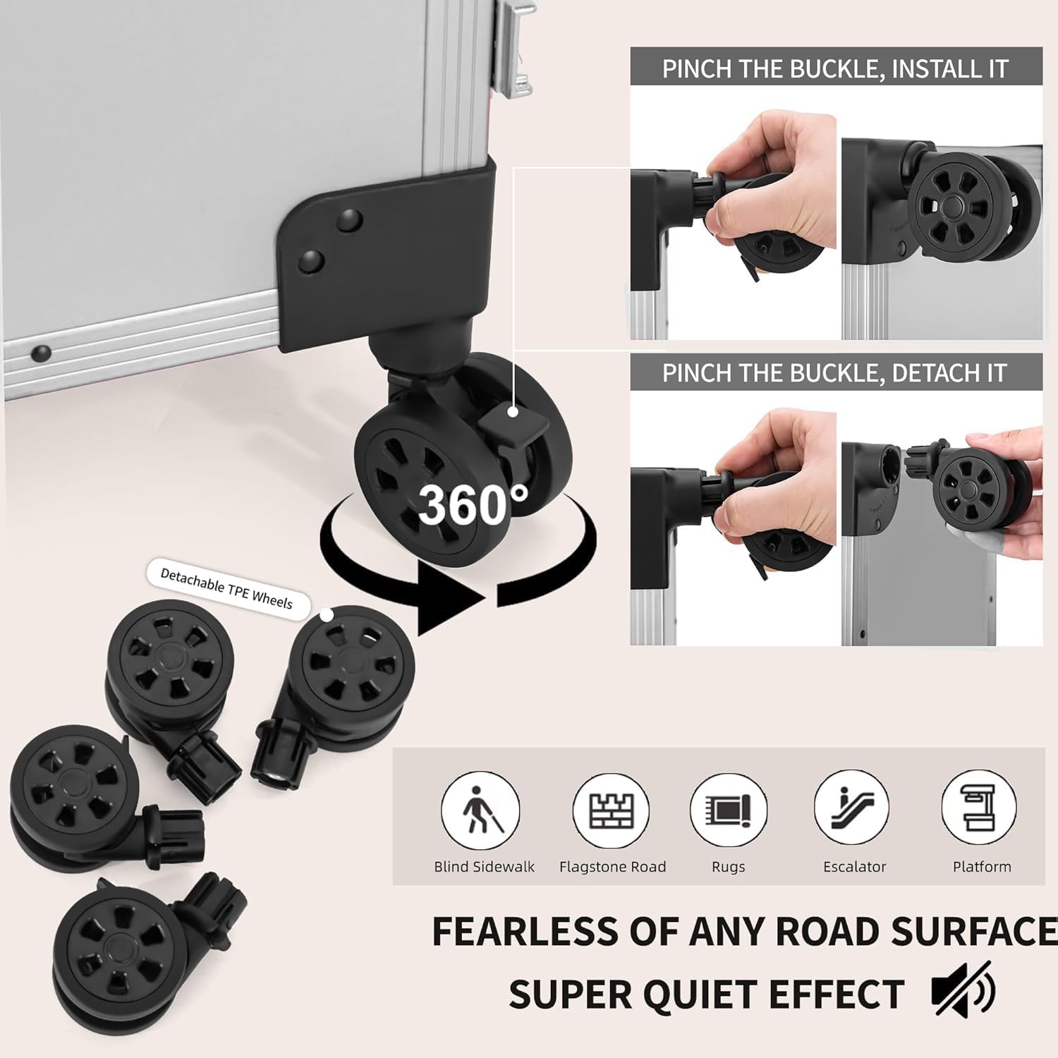Smooth TPE Wheels: This makeup case features four top-notch 360 degree TPE wheels No matter what kind of moving road surface, it can keep the box highly silent. Wheel disassembly and installation, super worry free and effortless. No need for any auxiliary tools, just pinch the buckles on both sides of the wheel and apply a little force to easily install and remove the wheel.
