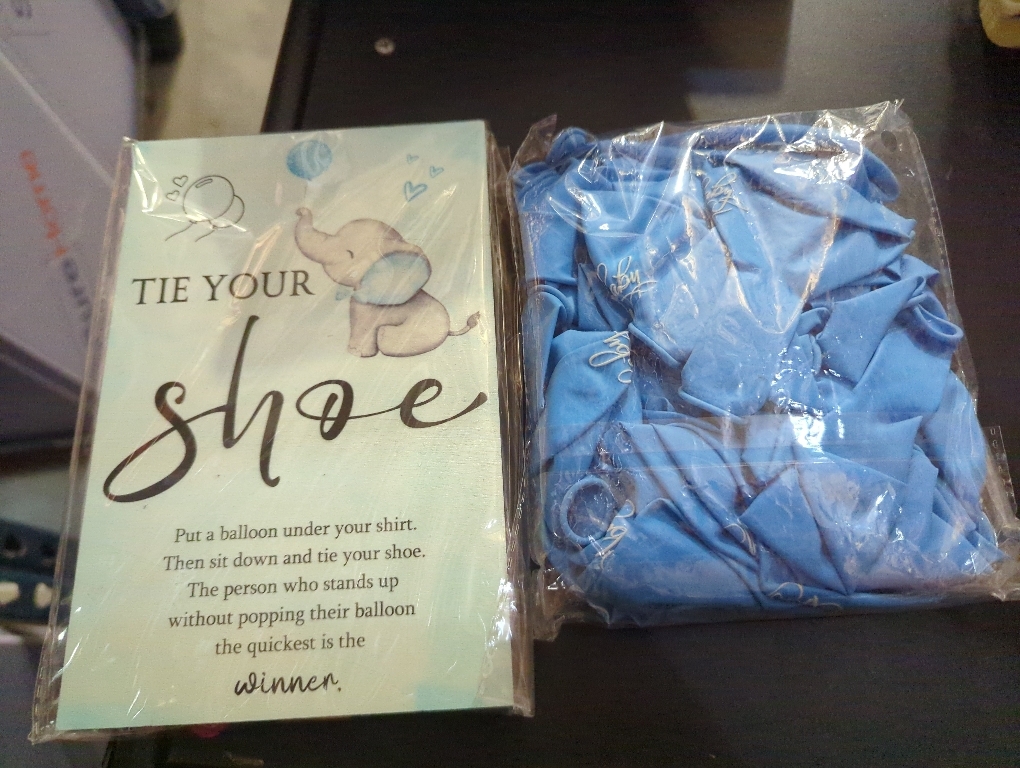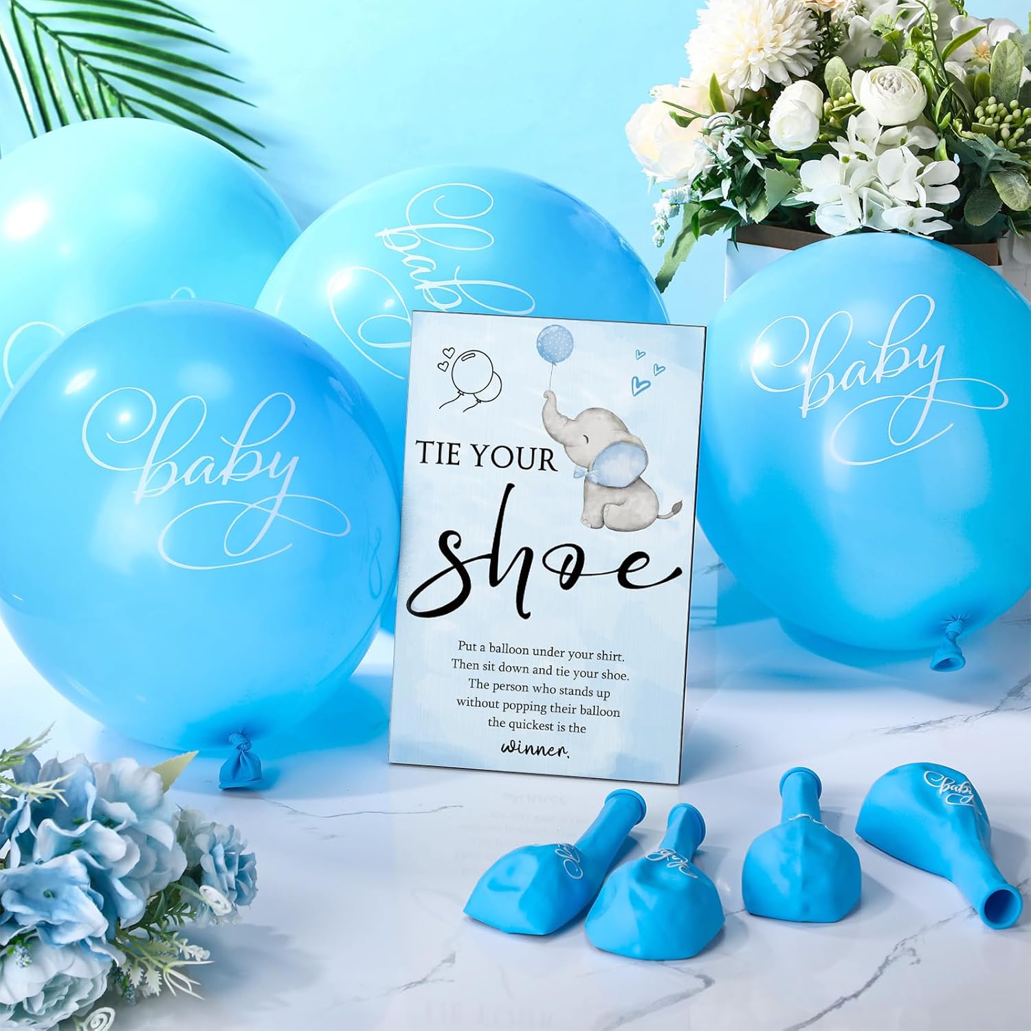 Roowest 51 Pcs Tie Your Shoe Baby Shower Game Sign Wooden Sign Greenery Gift Sets Gender Reveal Party Favors 50 Balloons Latex Balloons for Game Supplies(Blue,Elephant)