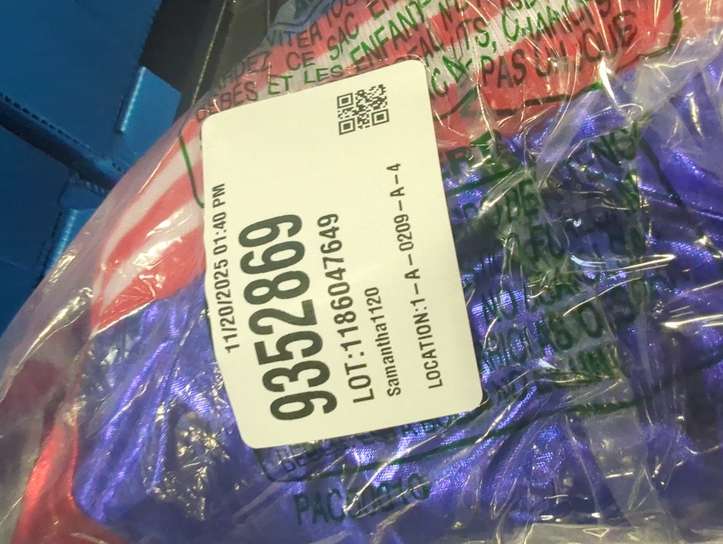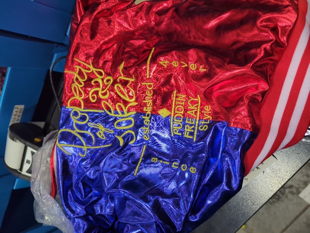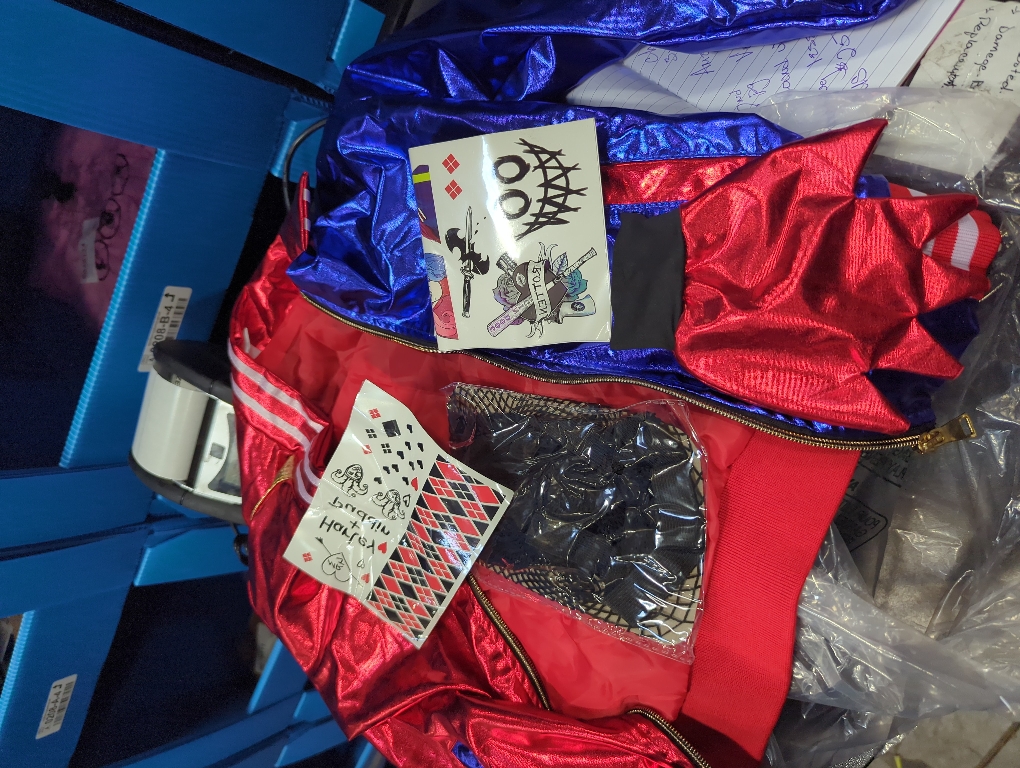 Costume includes metallic blue and red jacket with "Property of Joker printed in gold on the back and attached shirt that says "Daddy's 'lil Monster"