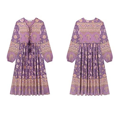 R.Vivimos Women's Long Sleeve Floral Print Retro V Neck Tassel Bohemian Midi Dresses (Medium Darkpurple#1)