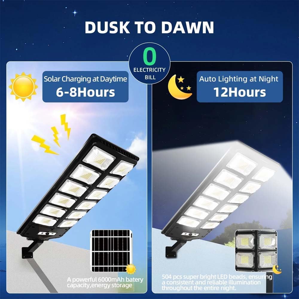 【High Brightness Solar Lighting】Illuminate large outdoor areas with 100,000 lumens of powerful solar lighting. Environmentally friendly and cost-efficient, it charges using sunlight and includes a motion sensor and remote control for hands-free, intelligent lighting.