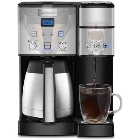 The Cuisinart Coffee Center features a fully automatic thermal coffeemaker on one side and a single-serve brewer on the other. Single-Serve Features: 3 serving sizes: 6, 8, 10 oz., K-Cup pod compatible, Includes Cuisinarts HomeBarista Reusable Filter Cup which lets you use your own coffee,Removable 40oz reservoir and Energy Save modeRemovable drip tray for travel mugsCharcoal water filter Carafe Brewer Features: 10-cup thermal carafe with stainless steel handle, Fully automatic 24-hour brew start, self-clean, ready alert, Brew Strength Control select BOLD for stronger coffee flavor, Easy-view water windowBrew Pause feature andGold-tone coffee filter that lets only pure coffee flavor flow through.