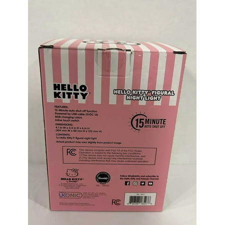 NWOT Hello Kitty Figural Night Light Features 15-Minute Auto Shut-off Function Powered By USB Cable RGB Changing Colors Inline Touch Switch Dimensions 4.1 in Wide X 3.5 in D X 6 in High