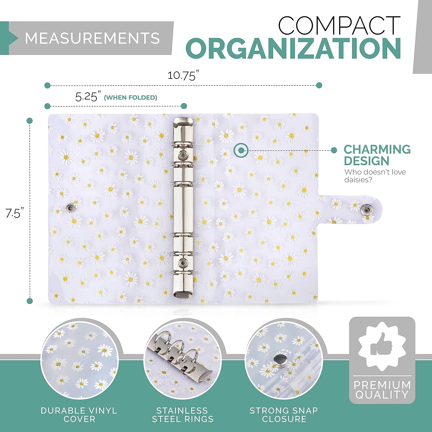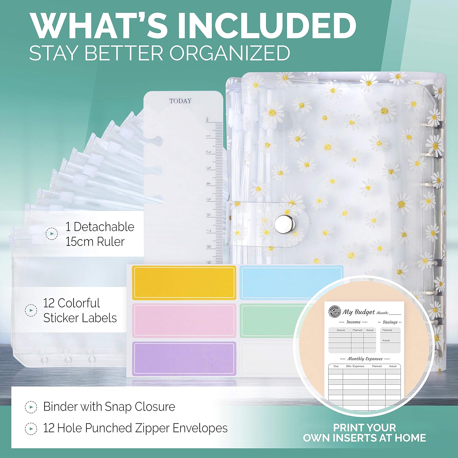 Organize in Style with Saveyon Daisy - Embrace the elegance of the Saveyon Daisy all-purpose binder, featuring 12 clear A6 cash envelopes for budgeting and delightful pastel labels. While commonly utilized with the cash envelope system as the ideal compact budget book, this budget binder with zipper envelopes caters to all ages and organizational needs. Stylish and Functional - The captivating Daisy design makes a statement in this budget binder set. The durable PVC cover features a secure snap closure, and the waterproof clear zipper cash envelopes ensure constant visibility. Make use of the 12 colored labels for both efficient and stylish budget management. Multi-Purpose Utility – Our refillable money-saving binder with budget envelopes serves as the ultimate cash organizer, offering a quick overview of your finances. Employ it as a budget wallet, loose-leaf notebook binder, receipt organizer, coupon holder, or personal planner. Bonus Lifetime Printables - Every purchase grants access to complimentary planner printables, including budget sheets, monthly calendars, to-do lists, and more! Refer to the package insert for printable instructions to maintain order in your cash envelopes.