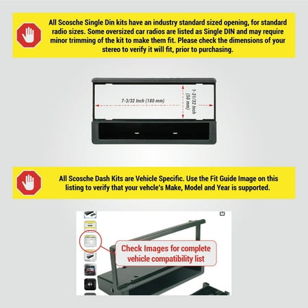 Designed specifically for Select 1995-2011 Ford, Lincoln, Mazda and Mercury Vehicles, the FD1423B dash kit ensures a seamless fit for your new car stereo. See Fit Guide in images to verify that your vehicle is compatible. With its sleek design and factory matched texture, this single DIN radio dash kit blends perfectly with your vehicle's interior, providing a factory-installed look for your new aftermarket stereo. The Scosche FD1426B radio installation kit comes with all necessary hardware, making it simple to install your stereo unit without the need for professional help. No special tools required. Includes detailed step-by-step instructions. Scosche Single DIN installation kits have a standard DIN cutout that is 50mm x 180mm. Some large screen floating stereo displays use a single din chassis that fit this kit. Check with Radio Manufacturer to verify cutout requirements. Crafted from factory quality automotive grade materials, the Scosche FD1423B Single DIN radio installation kit is designed to securely hold your stereo in place and withstand the rigors of daily use.