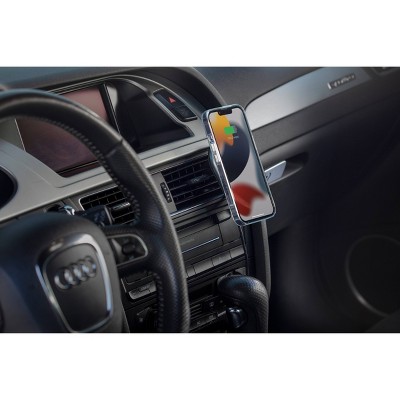 The Scosche MagicMount Pro Charge5 Dash/Vent Mounting Kit with a Qi-Certified Wireless Charger is a powerful magnetic mounting system for conveniently mounting your Smartphone to the dash or vent inside your vehicle. You get 2 different mounting options inside one package - a vent or dash mount.