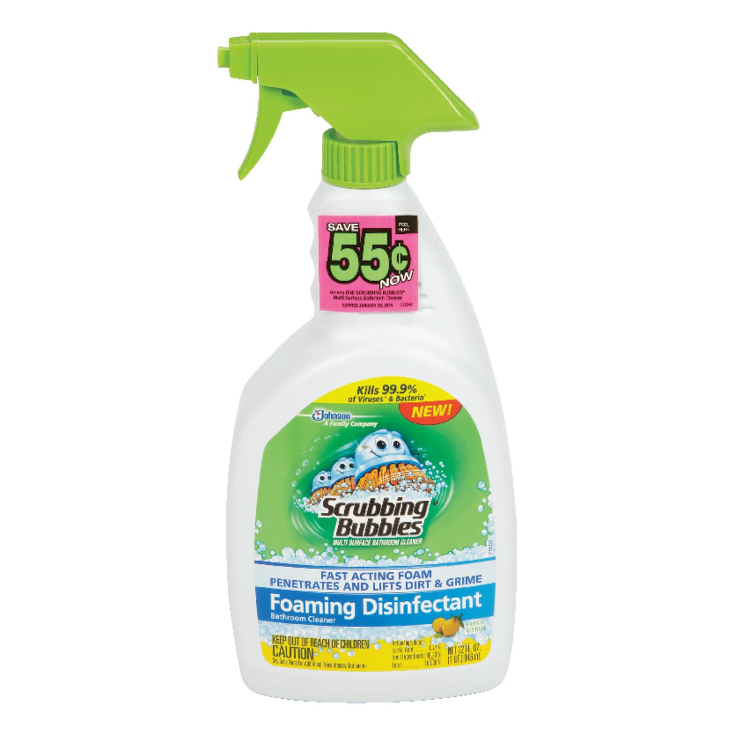 4 Pack Scrubbing Bubbles foaming bathroom cleaner puts the stain-fighting power of deep-penetrating foam to cling to bathroom surfaces, wipe out soap scum and send mold and mildew stains running for the drain. So, drag out the nice bath mat. Thereâs a foam party scheduled for your bathroom and dirt and grime is getting uninvited.