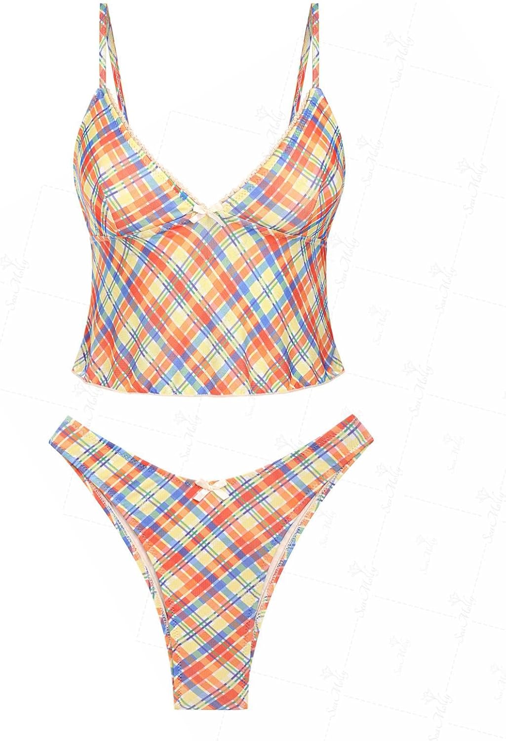 This tankini set features a charming gingham pattern and a delicate bowknot embellishment, adding a touch of timeless elegance.