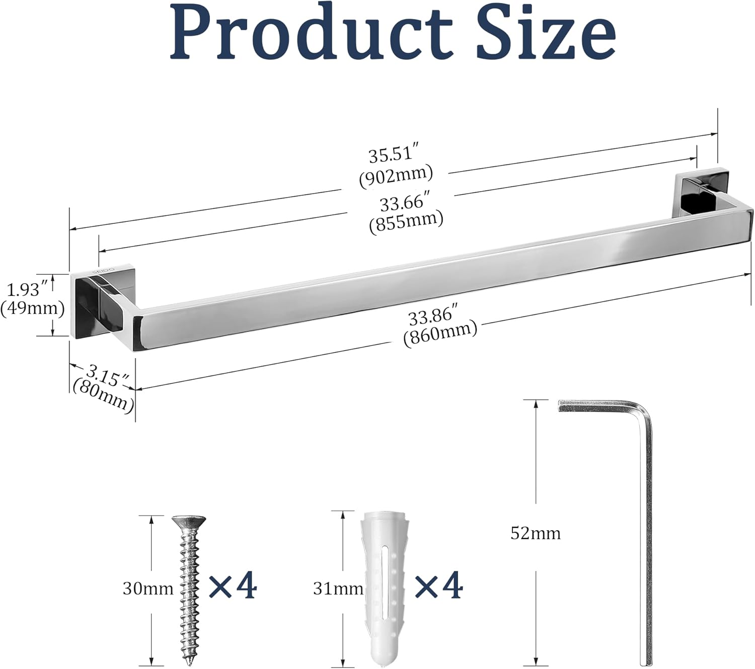 SEIDO Square Single Towel Bar, SUS 304 Stainless Bathroom Towel Holder 36 Inch Long, Modern Polished Chrome Towel Racks for Bathroom and Kitchen Storage, Heavy Duty Towel Rack Wall Mounted