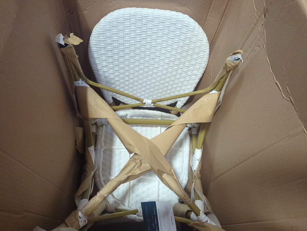 New Open box for inspection Set of 2 Color White Material: Rattan Finish: Purple, white Powder coating Assembly needed: No Weather resistant
