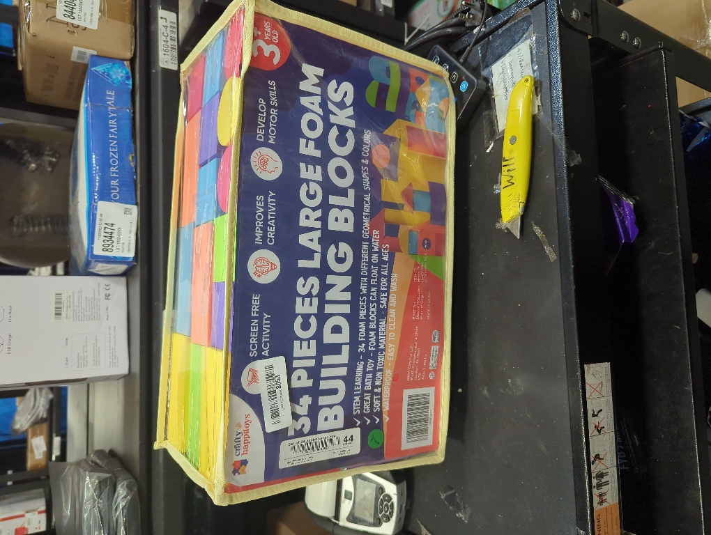 New open for inspection...Jumbo Foam Block Value Set - The set includes 34 pieces of giant foam blocks with a variety of shapes such as cubes, colors and sizes. The pieces are made larger for babies easy grip. It comes with a clear storage bag for keeping and carrying
