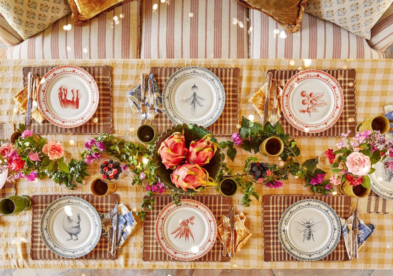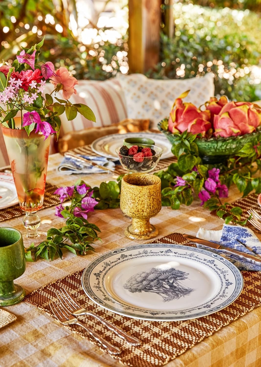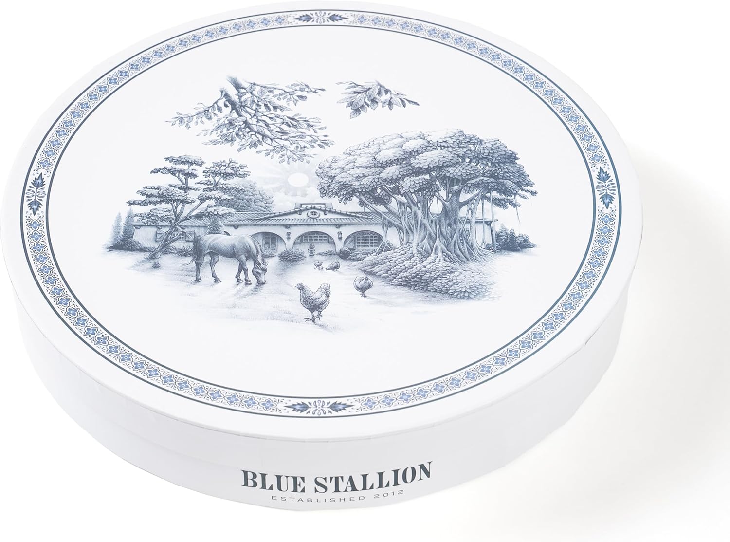 Set of 4 Blue and White Collectible Assorted Farm Animals, Veggies and Banyan Tree Dinner Plates 10.5" with Giftbox