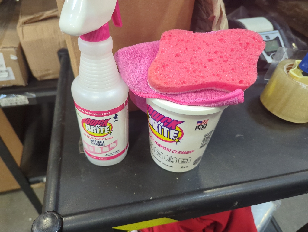 New Open for inspection Set of 4 Size 32oz cleaner , squirt bottle sponge and rag ULTIMATE ALL-PURPOSE CLEANER – Quick ’n Brite replaces multiple household cleaners, tackling tough stains, grease, and grime on carpets, ovens, BBQs, kitchens, shoes, and more. SAFE & ENVIRONMENTALLY FRIENDLY – Free from harmful chemicals, Quick ’n Brite is PET-SAFE, KID-SAFE, and doesn’t contain phosphates, scratch-causing abrasives, or harsh irritants. TOUGH ON STAINS, GENTLE ON SURFACES – Made from natural ingredients, our cleaner works fast and effectively without scratching or damaging surfaces. EASY TO USE – Follow simple instructions to clean nearly anything: stovetops, showers, shoes, bathtubs, countertops, and more. TRUSTED FOR OVER 70 YEARS – Proudly made in the USA by a family-owned company committed to safe, effective, and biodegradable cleaning solutions.