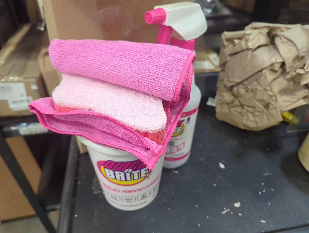 New Open box for inspection Set of 4 Size 32oz cleaner , squirt bottle sponge and rag ULTIMATE ALL-PURPOSE CLEANER – Quick ’n Brite replaces multiple household cleaners, tackling tough stains, grease, and grime on carpets, ovens, BBQs, kitchens, shoes, and more. SAFE & ENVIRONMENTALLY FRIENDLY – Free from harmful chemicals, Quick ’n Brite is PET-SAFE, KID-SAFE, and doesn’t contain phosphates, scratch-causing abrasives, or harsh irritants. TOUGH ON STAINS, GENTLE ON SURFACES – Made from natural ingredients, our cleaner works fast and effectively without scratching or damaging surfaces. EASY TO USE – Follow simple instructions to clean nearly anything: stovetops, showers, shoes, bathtubs, countertops, and more. TRUSTED FOR OVER 70 YEARS – Proudly made in the USA by a family-owned company committed to safe, effective, and biodegradable cleaning solutions.